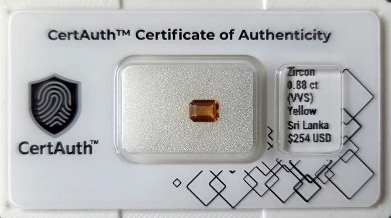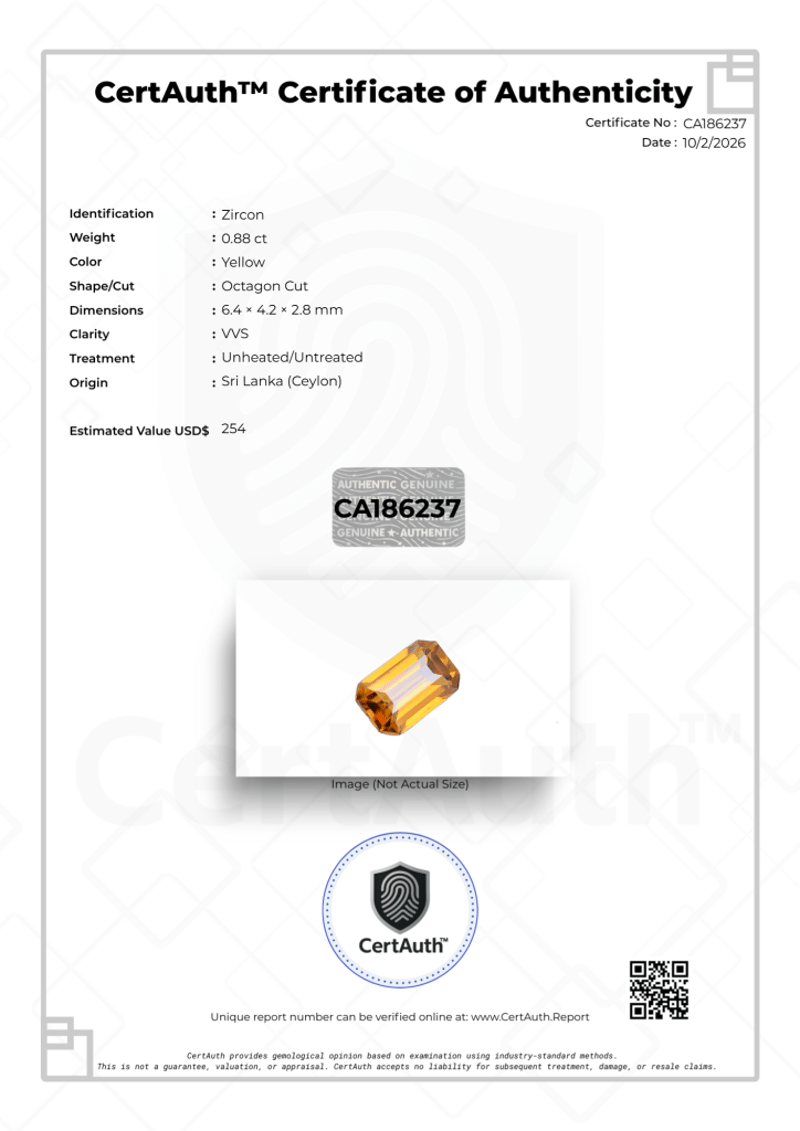 This Natural Zircon Features A Bright Yellow Body Colour With Excellent Brilliance And Fire. Precision Cut In An Octagon Shape, It Weighs 0.88 Carats And Displays Vvs Clarity. The Gemstone Is Unheated And Originates From Sri Lanka (Ceylon). Accompanied By A Certauth Digital Certificate For Authentication And Verification.