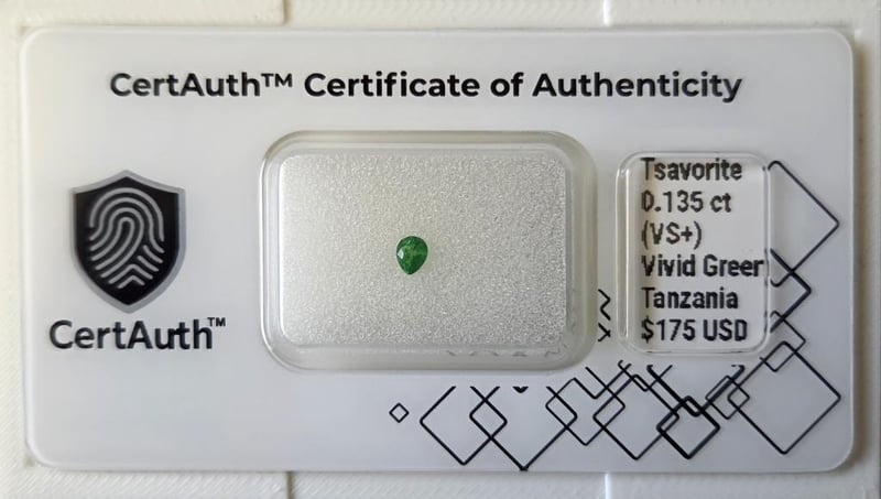 This Natural Tsavorite Garnet Displays A Vivid Green Colour With Excellent Brightness And Fire. Cut In A Classic Pear Shape, It Weighs 0.135 Carats And Shows Vs+ Clarity. The Gemstone Is Unheated And Originates From Tanzania. Accompanied By A Certauth Digital Certificate For Secure Authentication And Verification.