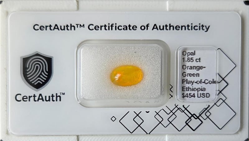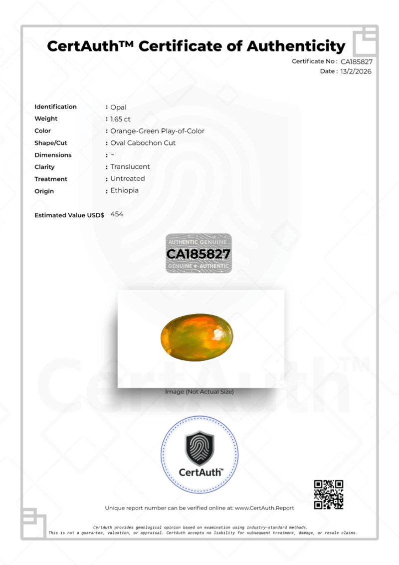 NATURAL 1.65CT ETHIOPIAN OPAL – OVAL CABOCHON – ORANGE-GREEN PLAY-OF-COLOR – UNTREATED – CERTAUTH CERTIFIED This Natural Ethiopian Opal Displays A Vibrant Orange-Green Play-Of-Color With Excellent Brightness And A Translucent Body. Cut In A Smooth Oval Cabochon, It Weighs 1.65 Carats And Remains Untreated. Sourced From Ethiopia And Accompanied By A Certauth Digital Certificate For Authentication And Verification.• Gemstone: Opal• Carat Weight: 1.65 Ct• Colour: Orange-Green Play-Of-Color• Cut: Oval Cabochon• Clarity: Translucent• Treatment: Untreated• Origin: Ethiopia• Certification: Certauth Digital Certificate (Ca185827)• Estimated Value: $454 Usd Condition: Good - Refer Images 0488482+33