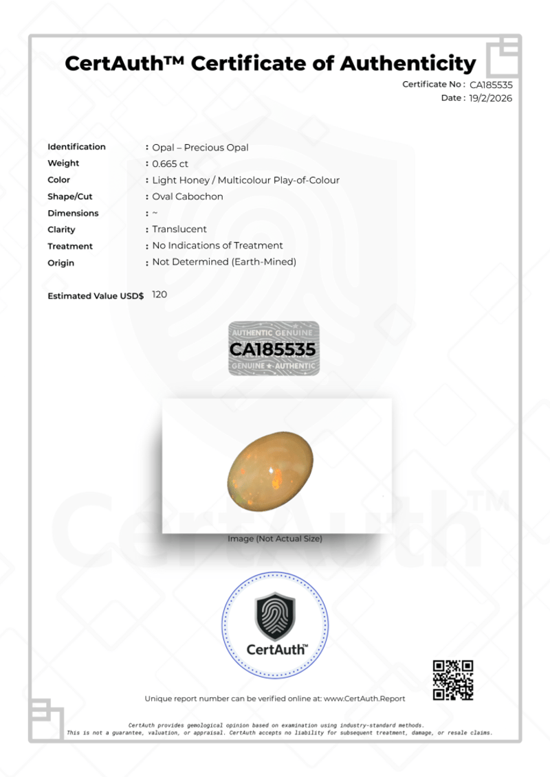 0.665CT LIGHT HONEY PRECIOUS OPAL OVAL CABOCHON – CERTIFIED This 0.665Ct Precious Opal Exhibits A Warm Light Honey Body Tone Complemented By Vibrant Multicolour Play-Of-Colour. Cut As An Oval Cabochon, The Gemstone Features A Smooth Polished Dome And Attractive Translucent Clarity.With No Indications Of Treatment And Confirmed As Earth-Mined, This Natural Opal Offers Distinctive Character And Versatile Jewellery Potential. Certified By Certauth With An Estimated Value Of Usd$ 120, It Presents An Appealing Addition To Any Gemstone Collection.This Gemstone Is Securely Housed Within An Official Certauth Securecard, Providing Tamper-Evident Protection, Authenticity Assurance, And Secure Handling.• Gemstone: Opal – Precious Opal• Carat Weight: 0.665 Ct• Colour: Light Honey / Multicolour Play-Of-Colour• Cut: Oval Cabochon• Clarity: Translucent• Treatment: No Indications Of Treatment• Dimensions: ~• Origin: Not Determined (Earth-Mined)• Certification: Certauth• Certification Number: Ca185535• Estimated Value: Usd$ 120 Condition: Good - Refer Images 0488498+3