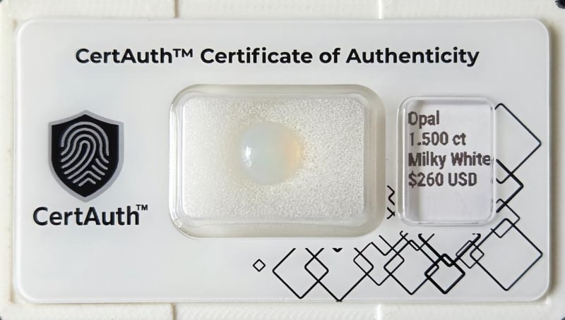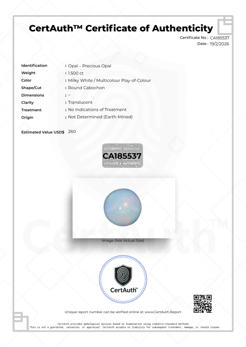 1.500CT MILKY WHITE PRECIOUS OPAL ROUND CABOCHON – CERTIFIED This 1.500Ct Precious Opal Displays A Soft Milky White Body Tone Illuminated By Vibrant Multicolour Play-Of-Colour. Cut As A Round Cabochon, The Gemstone Features A Smooth Polished Dome And Attractive Translucent Clarity.With No Indications Of Treatment And Confirmed As Earth-Mined, This Natural Opal Offers Classic Appeal And Excellent Versatility For Bespoke Jewellery Design. Certified By Certauth With An Estimated Value Of Usd$ 260, It Represents A Refined Collector’S Piece.This Gemstone Is Securely Housed Within An Official Certauth Securecard, Providing Tamper-Evident Protection, Authenticity Assurance, And Secure Handling.• Gemstone: Opal – Precious Opal• Carat Weight: 1.500 Ct• Colour: Milky White / Multicolour Play-Of-Colour• Cut: Round Cabochon• Clarity: Translucent• Treatment: No Indications Of Treatment• Dimensions: ~• Origin: Not Determined (Earth-Mined)• Certification: Certauth• Certification Number: Ca185537• Estimated Value: Usd$ 260 Condition: Good - Refer Images 0488498+5