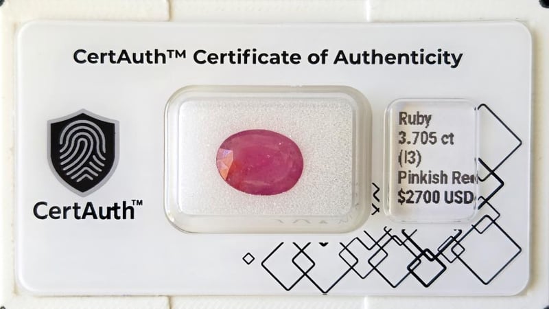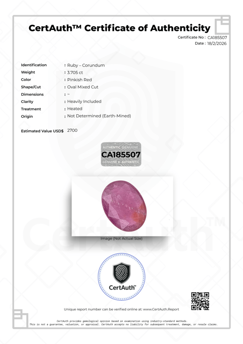 3.705CT PINKISH RED RUBY OVAL MIXED CUT – CERTIFIED This 3.705Ct Ruby – Corundum Displays A Rich Pinkish Red Hue And Is Fashioned In An Oval Mixed Cut. The Gemstone Exhibits Natural Characteristics Consistent With Its Heavily Included Clarity Grading.Confirmed As Earth-Mined And Heat Treated, This Ruby Offers Vibrant Colour Presence In A Well-Proportioned Size Suitable For Statement Jewellery. Certified By Certauth With An Estimated Value Of Usd$ 2700, It Presents Strong Collector And Design Appeal.This Gemstone Is Securely Housed Within An Official Certauth Securecard, Providing Tamper-Evident Protection, Authenticity Assurance, And Secure Handling.• Gemstone: Ruby – Corundum• Carat Weight: 3.705 Ct• Colour: Pinkish Red• Cut: Oval Mixed Cut• Clarity: Heavily Included• Treatment: Heated• Dimensions: ~• Origin: Not Determined (Earth-Mined)• Certification: Certauth• Certification Number: Ca185507• Estimated Value: Usd$ 2700 Condition: Good - Refer Images 0488498+8
