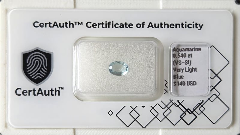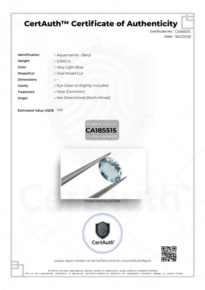 0.540CT VERY LIGHT BLUE AQUAMARINE OVAL MIXED CUT – CERTIFIED This 0.540Ct Aquamarine – Beryl Displays A Delicate Very Light Blue Hue And Is Fashioned In An Oval Mixed Cut. The Gemstone Presents Eye Clean To Slightly Included Clarity, Offering Bright Transparency And Refined Brilliance.Confirmed As Earth-Mined And Subjected To Heat (Common), This Aquamarine Offers Soft Pastel Tones Ideal For Elegant Jewellery Settings. Certified By Certauth With An Estimated Value Of Usd$ 140, It Represents Accessible Natural Gemstone Ownership.This Gemstone Is Securely Housed Within An Official Certauth Securecard, Providing Tamper-Evident Protection, Authenticity Assurance, And Secure Handling.• Gemstone: Aquamarine – Beryl• Carat Weight: 0.540 Ct• Colour: Very Light Blue• Cut: Oval Mixed Cut• Clarity: Eye Clean To Slightly Included• Treatment: Heat (Common)• Dimensions: ~• Origin: Not Determined (Earth-Mined)• Certification: Certauth• Certification Number: Ca185515• Estimated Va Condition: Good - Refer Images 0488498+17