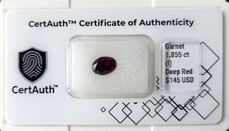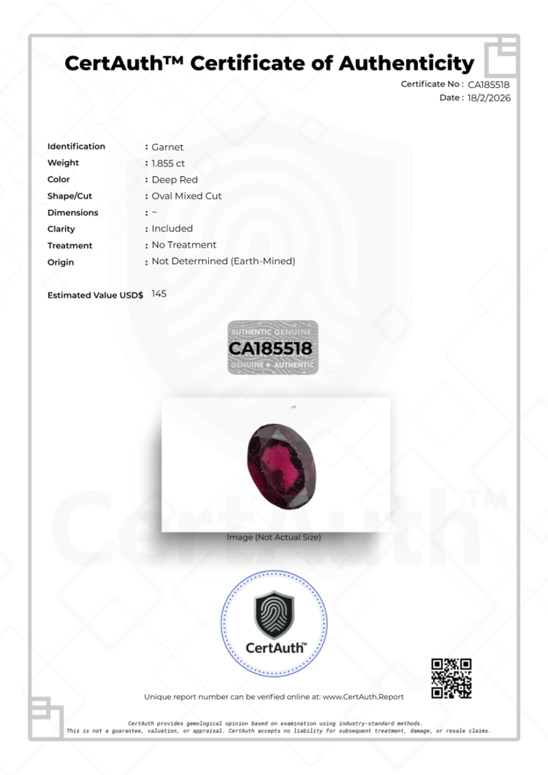 1.855CT DEEP RED GARNET OVAL MIXED CUT – CERTIFIED This 1.855Ct Garnet Displays A Rich Deep Red Hue And Is Fashioned In An Oval Mixed Cut. The Gemstone Exhibits Natural Characteristics Consistent With Its Included Clarity Grading.Confirmed As Earth-Mined And Showing No Treatment, This Garnet Offers Strong Colour Presence In A Classic Oval Form Suitable For Fine Jewellery. Certified By Certauth With An Estimated Value Of Usd$ 145, It Presents An Attractive And Versatile Natural Gemstone Option.This Gemstone Is Securely Housed Within An Official Certauth Securecard, Providing Tamper-Evident Protection, Authenticity Assurance, And Secure Handling.• Gemstone: Garnet• Carat Weight: 1.855 Ct• Colour: Deep Red• Cut: Oval Mixed Cut• Clarity: Included• Treatment: No Treatment• Dimensions: ~• Origin: Not Determined (Earth-Mined)• Certification: Certauth• Certification Number: Ca185518• Estimated Value: Usd$ 145 Condition: Good - Refer Images 0488498+18