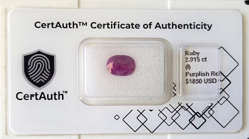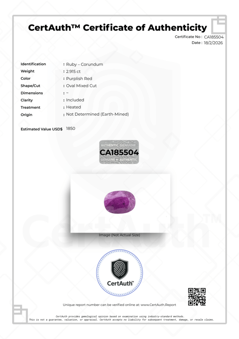 2.915CT PURPLISH RED RUBY OVAL MIXED CUT – CERTIFIED This 2.915Ct Ruby – Corundum Displays A Vibrant Purplish Red Hue And Is Fashioned In An Oval Mixed Cut. The Gemstone Exhibits Natural Characteristics Consistent With Its Included Clarity Grading.Confirmed As Earth-Mined And Heat Treated, This Ruby Offers Strong Colour Presence In A Versatile Oval Form Suited To Fine Jewellery Design. Certified By Certauth With An Estimated Value Of Usd$ 1850, It Presents Attractive Size And Collector Appeal.This Gemstone Is Securely Housed Within An Official Certauth Securecard, Providing Tamper-Evident Protection, Authenticity Assurance, And Secure Handling.• Gemstone: Ruby – Corundum• Carat Weight: 2.915 Ct• Colour: Purplish Red• Cut: Oval Mixed Cut• Clarity: Included• Treatment: Heated• Dimensions: ~• Origin: Not Determined (Earth-Mined)• Certification: Certauth• Certification Number: Ca185504• Estimated Value: Usd$ 1850 Condition: Good - Refer Images 0488498+21