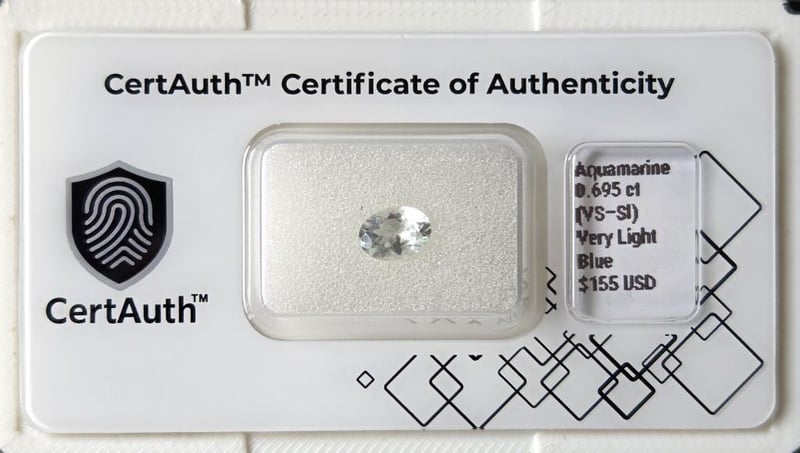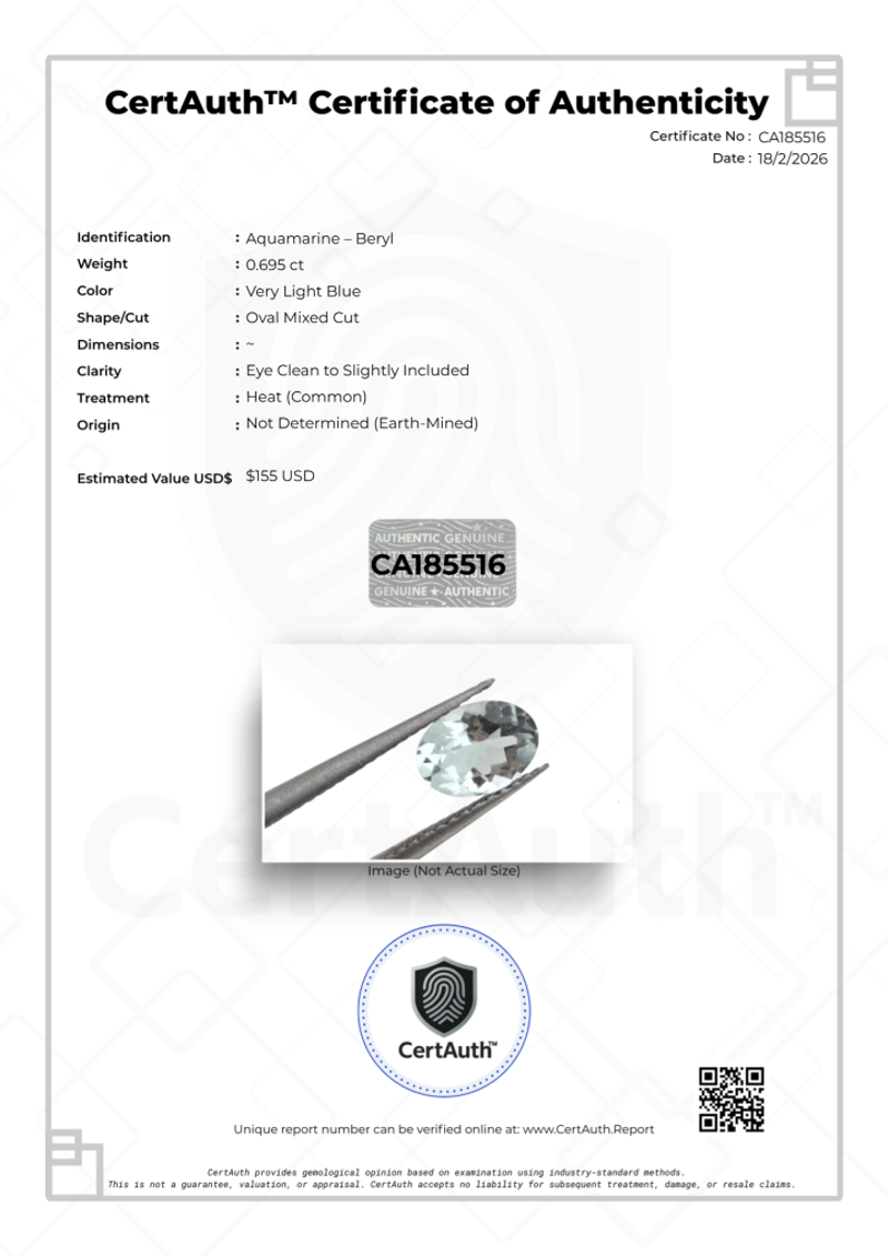 0.695CT VERY LIGHT BLUE AQUAMARINE OVAL MIXED CUT – CERTIFIED This 0.695Ct Aquamarine – Beryl Displays A Delicate Very Light Blue Hue And Is Fashioned In An Oval Mixed Cut. The Gemstone Presents Eye Clean To Slightly Included Clarity, Offering Bright Transparency And Soft Brilliance.Confirmed As Earth-Mined And Subjected To Heat (Common), This Aquamarine Offers Subtle Pastel Tones Suited To Refined Jewellery Designs. Certified By Certauth With An Estimated Value Of $155 Usd, It Represents An Attractive And Versatile Natural Gemstone Option.This Gemstone Is Securely Housed Within An Official Certauth Securecard, Providing Tamper-Evident Protection, Authenticity Assurance, And Secure Handling.• Gemstone: Aquamarine – Beryl• Carat Weight: 0.695 Ct• Colour: Very Light Blue• Cut: Oval Mixed Cut• Clarity: Eye Clean To Slightly Included• Treatment: Heat (Common)• Dimensions: ~• Origin: Not Determined (Earth-Mined)• Certification: Certauth• Certification Number: Ca185516• Estimated Value Condition: Good - Refer Images 0488498+23