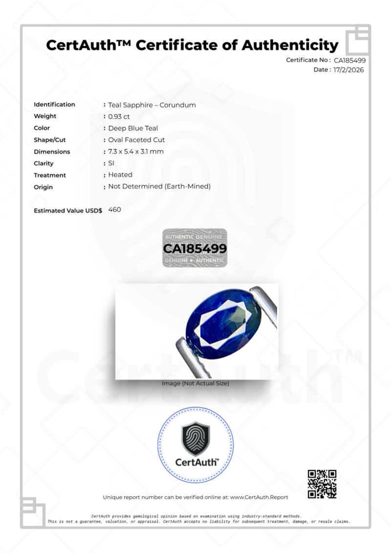 This 0.93Ct Teal Sapphire (Corundum) Features A Rich Deep Blue Teal Colour