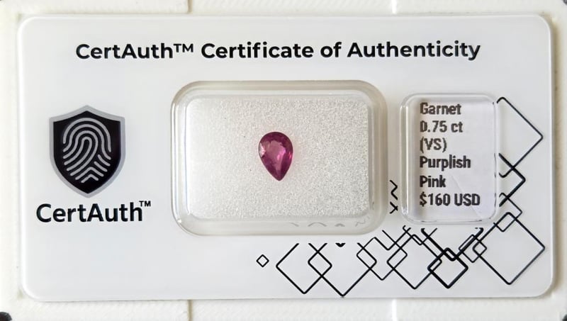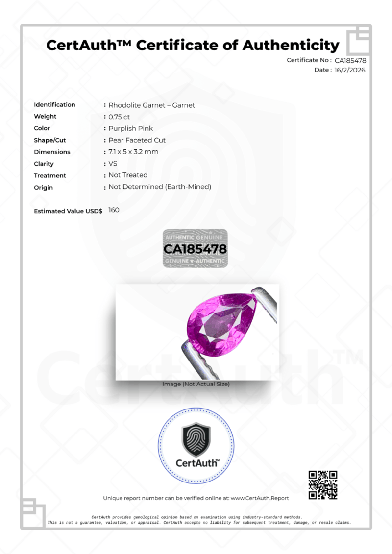 0.75CT RHODOLITE GARNET PEAR FACETED CUT – CERTIFIED This 0.75Ct Rhodolite Garnet Displays An Attractive Purplish Pink Colour And Is Precision Cut In A Pear Faceted Cut, Offering Lively Brilliance And Elegant Proportions. Measuring 7.1 X 5 X 3.2 Mm, The Stone Presents A Refined Shape Ideal For Delicate Jewellery Designs.Graded Vs Clarity And With No Indications Of Treatment, This Earth-Mined Garnet Offers Natural Beauty And Excellent Transparency. Certified By Certauth With An Estimated Value Of Usd$ 160.This Gemstone Is Securely Housed Within An Official Certauth Securecard, Providing Tamper-Evident Protection, Authenticity Assurance, And Secure Handling.• Gemstone: Rhodolite Garnet• Carat Weight: 0.75 Ct• Colour: Purplish Pink• Cut: Pear Faceted Cut• Clarity: Vs• Treatment: Not Treated• Dimensions: 7.1 X 5 X 3.2 Mm• Origin: Not Determined (Earth-Mined)• Certification: Certauth• Certification Number: Ca185478• Estimated Value: Usd$ 160 Condition: Good - Refer Images 0488498+32