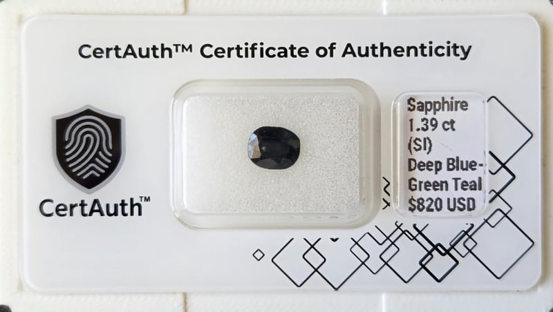 1.39CT TEAL SAPPHIRE OVAL FACETED CUT – CERTIFIED This 1.39Ct Teal Sapphire (Corundum) Features A Deep Blue-Green Teal Body Colour, Beautifully Presented In An Oval Faceted Cut That Enhances Its Brilliance And Colour Depth.Measuring 7.5 X 6.3 X 3.9 Mm, This Earth-Mined Sapphire Displays A Rich, Saturated Tone With Natural Inclusions (Si Clarity) Consistent With Genuine Corundum. The Stone Has Undergone Heat Treatment, A Standard And Widely Accepted Enhancement For Sapphires.Certified By Certauth With An Estimated Value Of Usd$ 820, This Gemstone Is Securely Housed Within An Official Certauth Securecard, Providing Tamper-Evident Protection, Authenticity Assurance, And Secure Handling.• Gemstone: Teal Sapphire (Corundum)• Carat Weight: 1.39 Ct• Colour: Deep Blue-Green Teal• Cut: Oval Faceted Cut• Dimensions: 7.5 X 6.3 X 3.9 Mm• Clarity: Si• Treatment: Heated• Origin: Not Determined (Earth-Mined)• Certification: Certauth• Certification Number: Ca185494• Estimated Value: Usd$ 820 Condition: Good - Refer Images 0488498+35