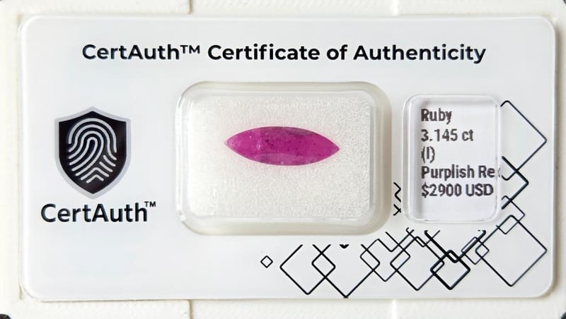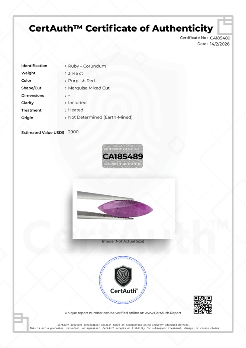 3.145CT PURPLISH RED RUBY MARQUISE CUT – HEATED, CERTIFIED This 3.145Ct Ruby (Corundum) Is Presented In An Elegant Marquise Mixed Cut, Highlighting Its Elongated Shape And Vibrant Purplish Red Colour.With A Clarity Grade Of Included, The Stone Displays Natural Internal Characteristics Typical Of Rubies, Adding To Its Individuality. The Ruby Has Undergone Heat Treatment, A Common And Accepted Practice To Enhance Colour And Clarity.Certified By Certauth With An Estimated Value Of Usd$ 2900, This Gemstone Is Securely Housed In An Official Certauth Securecard, Providing Tamper-Evident Protection And Verified Authenticity.• Gemstone: Ruby (Corundum)• Carat Weight: 3.145 Ct• Colour: Purplish Red• Cut: Marquise Mixed Cut• Dimensions: Not Specified• Clarity: Included• Treatment: Heated• Origin: Not Determined (Earth-Mined)• Certification: Certauth• Certification Number: Ca185489• Estimated Value: Usd$ 2900 Condition: Good - Refer Images 0488498+39