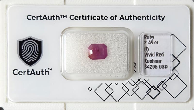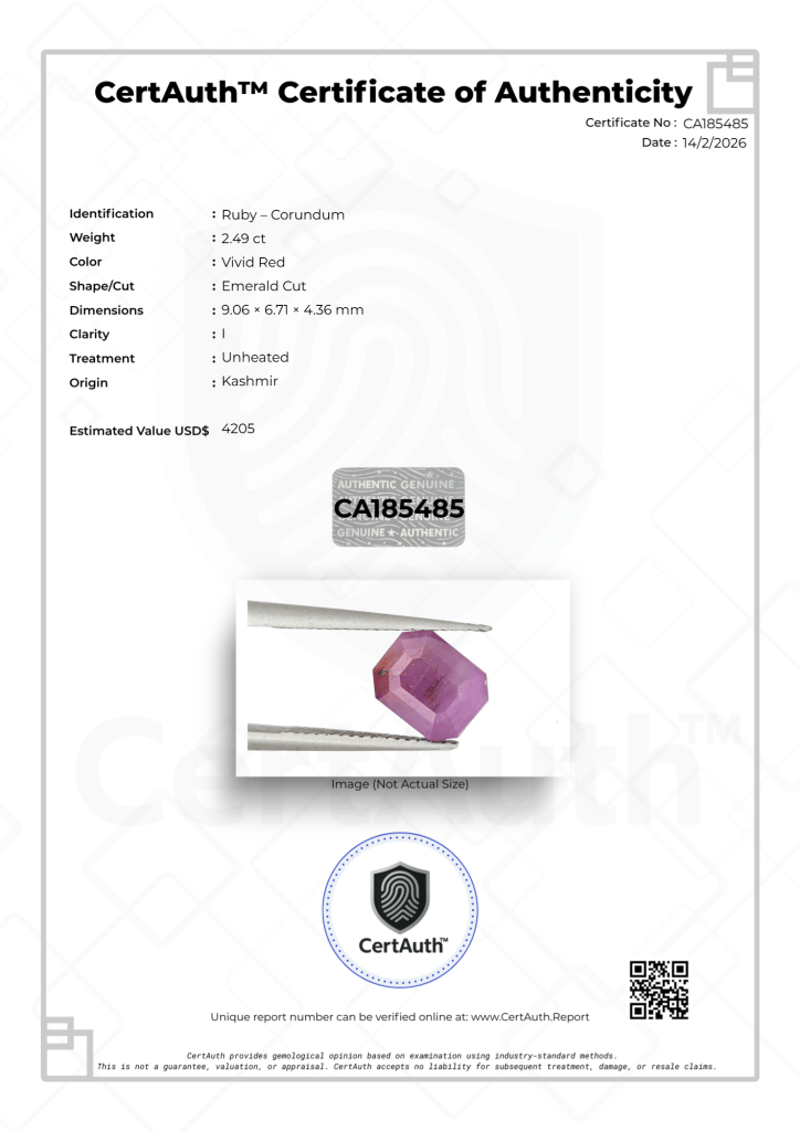 2.49CT VIVID RED RUBY EMERALD CUT – UNHEATED KASHMIR ORIGIN, CERTIFIED This 2.49Ct Ruby (Corundum) Is Presented In A Refined Emerald Cut,Highlighting Its Vivid Red Colour With Strong Saturation And ElegantStep-Cut Faceting.Originating From Kashmir And Confirmed As Unheated, This Ruby RetainsIts Natural Characteristics. With An Included Clarity Grade, VisibleInternal Features Are Present, Consistent With Natural Formation AndUntreated Material.Certified By Certauth With An Estimated Value Of Usd$ 4,205, ThisGemstone Is Securely Housed In An Official Certauth Securecard,Providing Tamper-Evident Protection And Verified Authenticity.• Gemstone: Ruby (Corundum)• Carat Weight: 2.49 Ct• Colour: Vivid Red• Cut: Emerald Cut• Dimensions: 9.06 X 6.71 X 4.36 Mm• Clarity: Included• Treatment: Unheated• Origin: Kashmir• Certification: Certauth• Certification Number: Ca185485• Estimated Value: Usd$ 4,205 Condition: Good - Refer Images 0488498+41