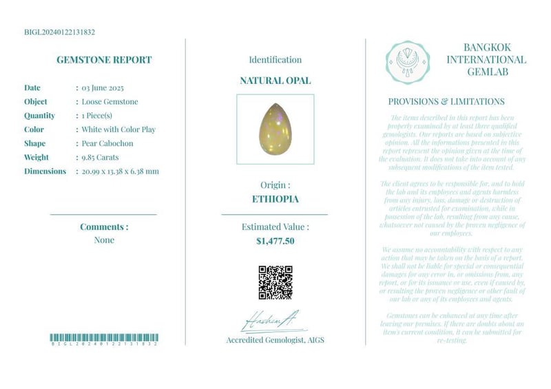9.85 CARATS CERTIFIED NATURAL OPAL Gemstone : Natural OpalCertificate Number : Bigl20240122131832Weight : 9.85 CaratsColor : White With Color PlayMeasurement : 20.99 X 13.38 X 6.38 MmShape : Pear CabochonQuantity : 1 PieceOrigin : EthiopiaComments : None• Use The Qr Code On The Packaging To View And Download The Certificate. • Verify Report Online At Www.Bangkokinternationalgemlab.Co Condition: Good - Refer Images 01611161+8