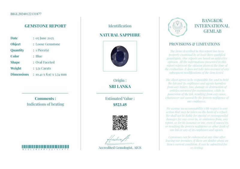 5.51 CARATS CERTIFIED NATURAL SAPPHIRE Gemstone : Natural SapphireCertificate Number : Bigl20240122131877Weight : 5.51 CaratsColor : BlueMeasurement : 10.41 X 8.97 X 5.74 MmShape : Oval FacetedQuantity : 1 PieceOrigin : Sri LankaComments : Indications Of Heating• Use The Qr Code On The Packaging To View And Download The Certificate. • Verify Report Online At Www.Bangkokinternationalgemlab.Co Condition: Good - Refer Images 01611161+11