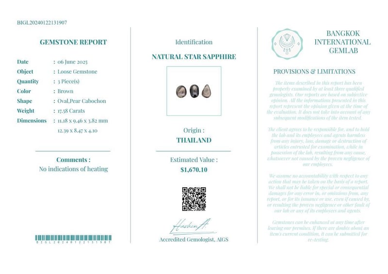 17.58 CARATS CERTIFIED NATURAL STAR SAPPHIRE Gemstone : Natural Star SapphireCertificate Number : Bigl20240122131907Weight : 17.58 CaratsColor : BrownMeasurement : 11.18 X 9.46 X 3.82 MmShape : Oval,Pear CabochonQuantity : 3 PieceOrigin : ThailandComments : No Indications Of Heating• Use The Qr Code On The Packaging To View And Download The Certificate. • Verify Report Online At Www.Bangkokinternationalgemlab.Co Condition: Good - Refer Images 01611161+13