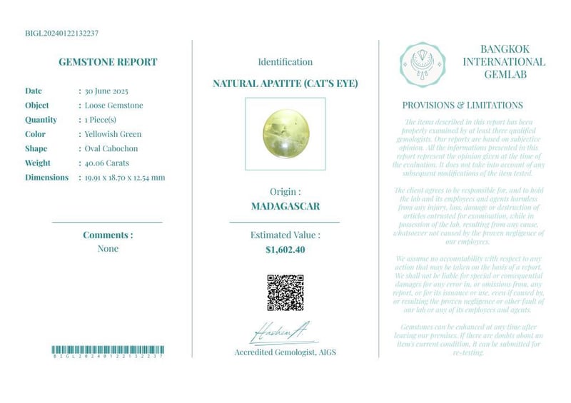 40.06 CARATS CERTIFIED NATURAL APATITE (CAT'S EYE) Gemstone : Natural Apatite (Cat'S Eye)Certificate Number : Bigl20240122132237Weight : 40.06 CaratsColor : Yellowish GreenMeasurement : 19.91 X 18.70 X 12.54 MmShape : Oval CabochonQuantity : 1 PieceOrigin : MadagascarComments : None• Use The Qr Code On The Packaging To View And Download The Certificate. • Verify Report Online At Www.Bangkokinternationalgemlab.Co Condition: Good - Refer Images 01611161+35