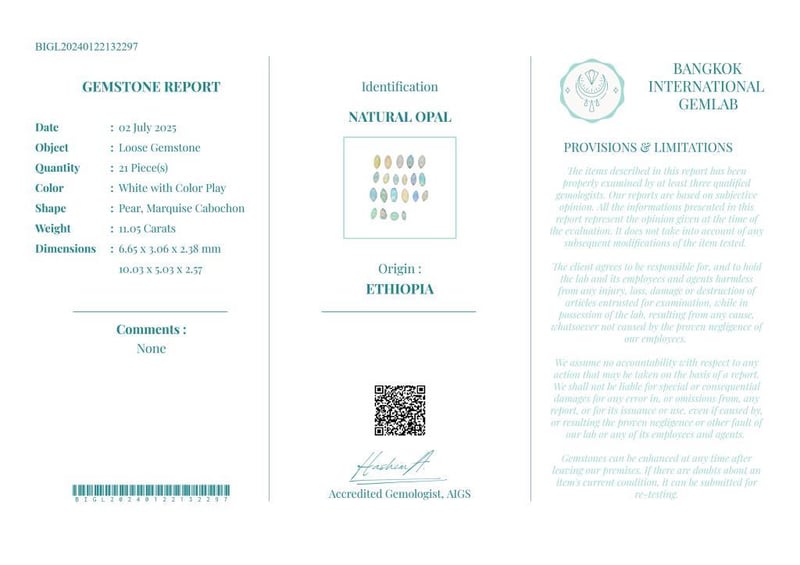 11.05 CARATS CERTIFIED NATURAL OPAL Gemstone : Natural OpalCertificate Number : Bigl20240122132297Weight : 11.05 CaratsColor : White With Color PlayMeasurement : 6.65 X 3.06 X 2.38 MmShape : Pear, Marquise CabochonQuantity : 21 PieceOrigin : EthiopiaComments : None• Use The Qr Code On The Packaging To View And Download The Certificate. • Verify Report Online At Www.Bangkokinternationalgemlab.Co Condition: Good - Refer Images 01611161+39