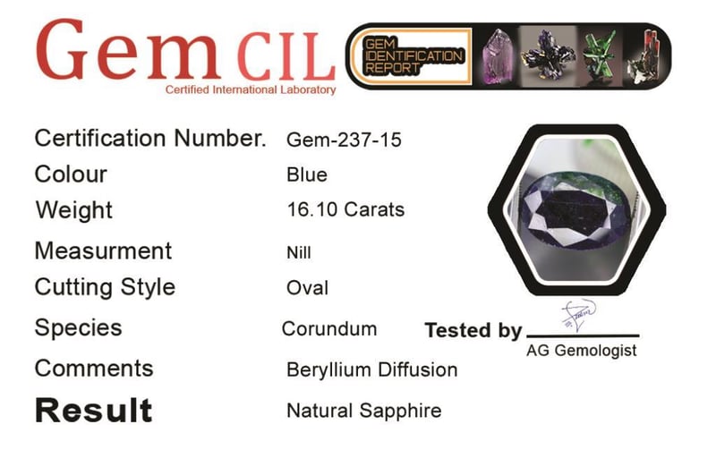 16.10 CARATS NATURAL CERTIFIED SAPPHIRE 16.10 Carats Natural Certified Sapphire Stone = Natural SapphireWeight = 16.10 Carats Cut = Oval Colour = Blue/GrayLustre = ExcellentTreatment = Beryllium Diffusion Note = Gem Cil, Certified, Precise Custom Cut (Not Commercial) Condition: Good - Refer Images 0488463+15
