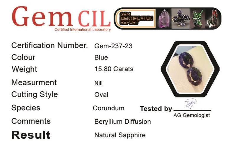 15.80 CARATS NATURAL CERTIFIED SAPPHIRE 15.80 Carats Natural Certified Sapphire Stone = Natural SapphireWeight = 15.80 Carats Cut = Oval Colour = BlueLustre = ExcellentTreatment = Beryllium Diffusion Note = Gem Cil, Certified, Precise Custom Cut (Not Commercial) Condition: Good - Refer Images 0488463+23