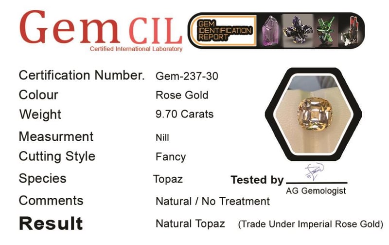 9.70 CARATS NATURAL IMPERIAL ROSE GOLD TOPAZ 9.70 Carats Natural Imperial Rose Gold Topaz Stone = Natural TopazWeight = 9.70 Carats Colour = Rose Gold Cut = Fancy Lustre = Excellent Treatment = Natural, No TreatmentQuality = Vvs (Premium)Note = Precise Custom Cut (Not Commercial) Condition: Good - Refer Images 0488463+30