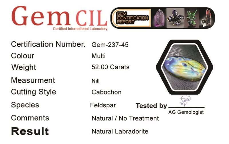 52.00 CARATS NATURAL LABRADORITE 52.00 Carats Natural Labradorite Stone = LabradoriteWeight = 52.00 CaratsColour = MultiCut = CabochonTreatment = No, Natural Quantity = 1Note = Gem Cil, Certified, Condition: Good - Refer Images 0488463+45