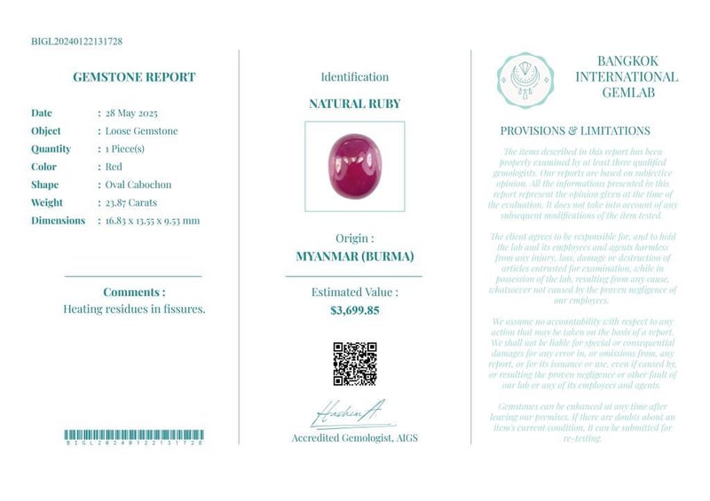 23.87 CARATS CERTIFIED NATURAL RUBY Gemstone : Natural RubyCertificate Number : Bigl20240122131728Weight : 23.87 CaratsColor : RedMeasurement : 16.83 X 13.55 X 9.53 MmShape : Oval CabochonQuantity : 1 PieceOrigin : Myanmar (Burma)Comments : Heating Residues In Fissures.• Use The Qr Code On The Packaging To View And Download The Certificate. • Verify Report Online At Www.Bangkokinternationalgemlab.Co Condition: Good - Refer Images 01611162+1