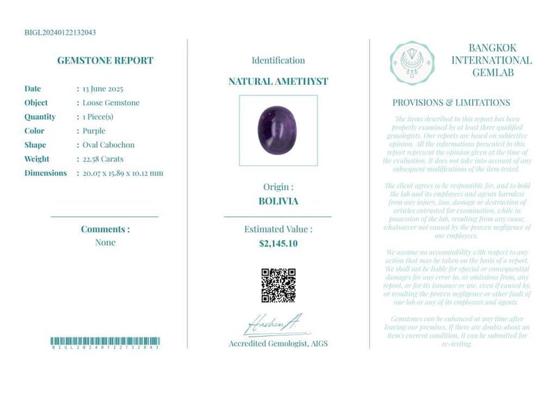 22.58 CARATS CERTIFIED NATURAL AMETHYST Gemstone : Natural AmethystCertificate Number : Bigl20240122132043Weight : 22.58 CaratsColor : PurpleMeasurement : 20.07 X 15.89 X 10.12 MmShape : Oval CabochonQuantity : 1 PieceOrigin : BoliviaComments : None• Use The Qr Code On The Packaging To View And Download The Certificate. • Verify Report Online At Www.Bangkokinternationalgemlab.Co Condition: Good - Refer Images 01611162+22
