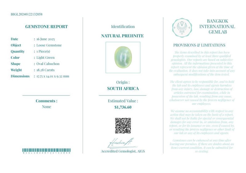 18.28 CARATS CERTIFIED NATURAL PREHNITE Gemstone : Natural PrehniteCertificate Number : Bigl20240122132058Weight : 18.28 CaratsColor : Light GreenMeasurement : 17.75 X 14.01 X 9.32 MmShape : Oval CabochonQuantity : 1 PieceOrigin : South AfricaComments : None• Use The Qr Code On The Packaging To View And Download The Certificate. • Verify Report Online At Www.Bangkokinternationalgemlab.Co Condition: Good - Refer Images 01611162+23