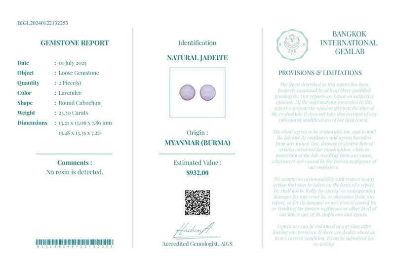 23.3 CARATS CERTIFIED NATURAL JADEITE Gemstone : Natural JadeiteCertificate Number : Bigl20240122132253Weight : 23.3 CaratsColor : LavenderMeasurement : 13.21 X 13.06 X 7.86 MmShape : Round CabochonQuantity : 2 PieceOrigin : Myanmar (Burma)Comments : No Resin Is Detected.• Use The Qr Code On The Packaging To View And Download The Certificate. • Verify Report Online At Www.Bangkokinternationalgemlab.Co Condition: Good - Refer Images 01611162+36