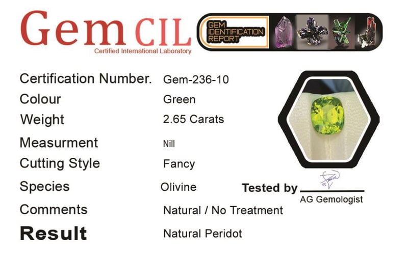 2.65 CARATS NATURAL LUSTROUS PERIDOT 2.65 Carats Natural Lustrous PeridotStone = Natural PeridotWeight = 2.65 CaratsColour = Green Cut = Fancy Note = Gem Cil, Certified, Precise Custom Cut (Not Commercial) Condition: Good - Refer Images 0488462+10
