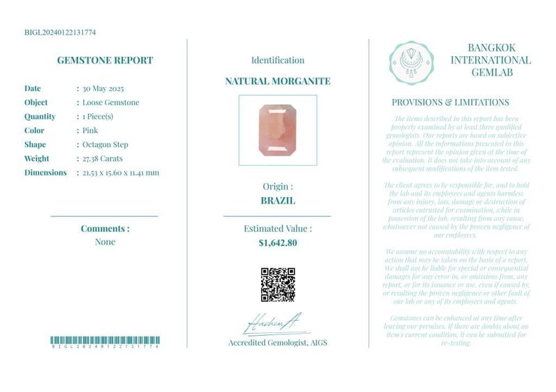 27.38 CARATS CERTIFIED NATURAL MORGANITE Gemstone : Natural MorganiteCertificate Number : Bigl20240122131774Weight : 27.38 CaratsColor : PinkMeasurement : 21.53 X 15.60 X 11.41 MmShape : Octagon StepQuantity : 1 PieceOrigin : BrazilComments : None• Use The Qr Code On The Packaging To View And Download The Certificate. • Verify Report Online At Www.Bangkokinternationalgemlab.Co Condition: Good - Refer Images 01611163+1