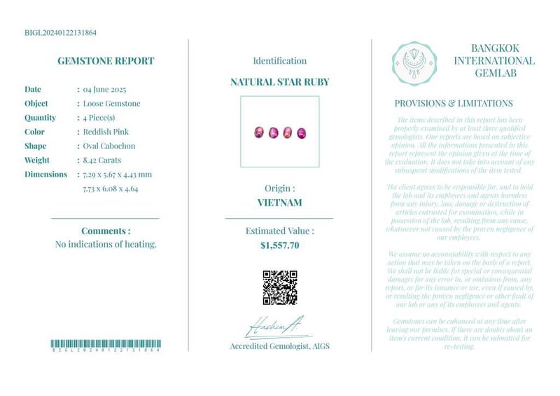 8.42 CARATS CERTIFIED NATURAL STAR RUBY Gemstone : Natural Star RubyCertificate Number : Bigl20240122131864Weight : 8.42 CaratsColor : Reddish PinkMeasurement : 7.29 X 5.67 X 4.43 MmShape : Oval CabochonQuantity : 4 PieceOrigin : VietnamComments : No Indications Of Heating.• Use The Qr Code On The Packaging To View And Download The Certificate. • Verify Report Online At Www.Bangkokinternationalgemlab.Co Condition: Good - Refer Images 01611163+1