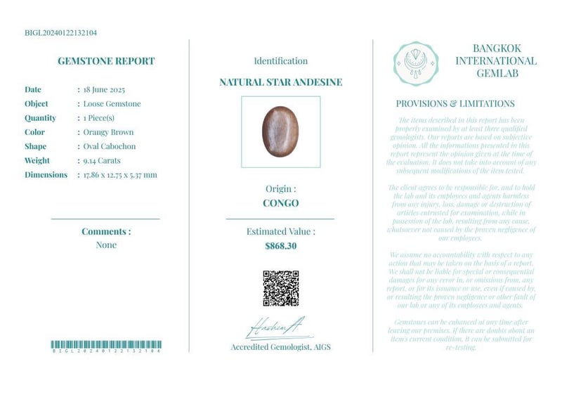 9.14 CARATS CERTIFIED NATURAL STAR ANDESINE Gemstone : Natural Star AndesineCertificate Number : Bigl20240122132104Weight : 9.14 CaratsColor : Orangy BrownMeasurement : 17.86 X 12.75 X 5.37 MmShape : Oval CabochonQuantity : 1 PieceOrigin : CongoComments : None• Use The Qr Code On The Packaging To View And Download The Certificate. • Verify Report Online At Www.Bangkokinternationalgemlab.Co Condition: Good - Refer Images 01611163+1