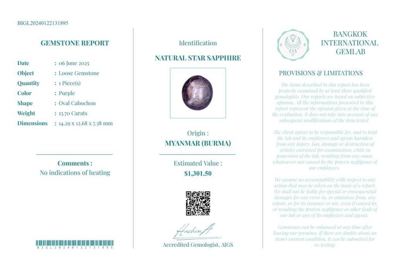 13.7 CARATS CERTIFIED NATURAL STAR SAPPHIRE Gemstone : Natural Star SapphireCertificate Number : Bigl20240122131895Weight : 13.7 CaratsColor : PurpleMeasurement : 14.29 X 12.68 X 7.38 MmShape : Oval CabochonQuantity : 1 PieceOrigin : Myanmar (Burma)Comments : No Indications Of Heating• Use The Qr Code On The Packaging To View And Download The Certificate. • Verify Report Online At Www.Bangkokinternationalgemlab.Co Condition: Good - Refer Images 01611164+12