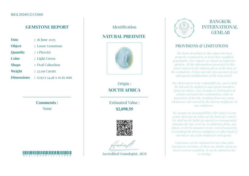 22.09 CARATS CERTIFIED NATURAL PREHNITE Gemstone : Natural PrehniteCertificate Number : Bigl20240122132060Weight : 22.09 CaratsColor : Light GreenMeasurement : 17.93 X 14.46 X 10.61 MmShape : Oval CabochonQuantity : 1 PieceOrigin : South AfricaComments : None• Use The Qr Code On The Packaging To View And Download The Certificate. • Verify Report Online At Www.Bangkokinternationalgemlab.Co Condition: Good - Refer Images 01611164+23