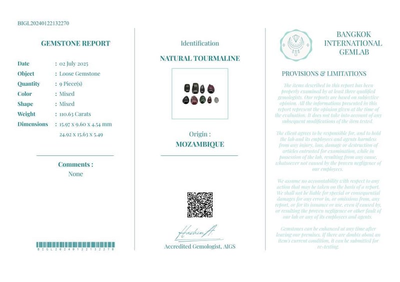 110.63 CARATS CERTIFIED NATURAL TOURMALINE Gemstone : Natural TourmalineCertificate Number : Bigl20240122132270Weight : 110.63 CaratsColor : MixedMeasurement : 15.97 X 9.60 X 4.54 MmShape : MixedQuantity : 9 PieceOrigin : MozambiqueComments : None• Use The Qr Code On The Packaging To View And Download The Certificate. • Verify Report Online At Www.Bangkokinternationalgemlab.Co Condition: Good - Refer Images 01611164+37