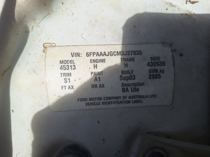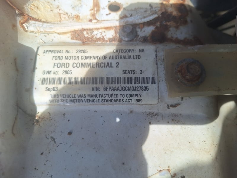 2003 FORD FALCON UTILITY Year: 2003 Make: Ford Model: Falcon VIN: 6FPAAAJGCM3J27835 Engine: Inline 6-Cylinder Transmission: Automatic Colour: White Description: Air Conditioning, Stereo, Rear Tray With Racks and Headboard, Wear And Tear Evident, Rust Evident Asset No: 1646640 Location: Pimpama, QLD