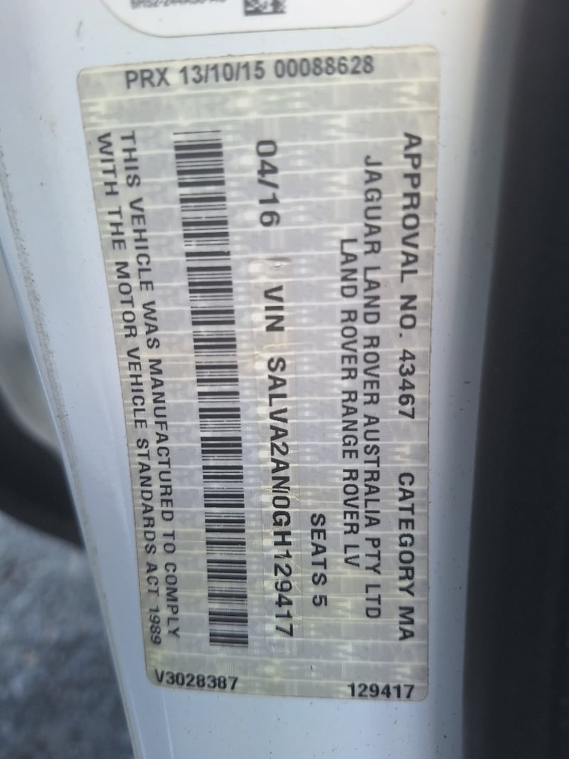 2016 LANDROVER RANGE ROVER EVOQUE WAGON Year: 2016 Make: Range Rover Model: Evoque VIN: SALVA2AN0GH129417 Engine: 4-Cylinder Transmission: Automatic Colour: White Description: Push Start Ignition, Leather Interior, Digital Display Unit, Air-Conditioning, Airbags, Power Windows, Power Mirrors, Traction Control, Park Assist, Cruise Control Asset No: 1649482 Location: Pimpama, QLD