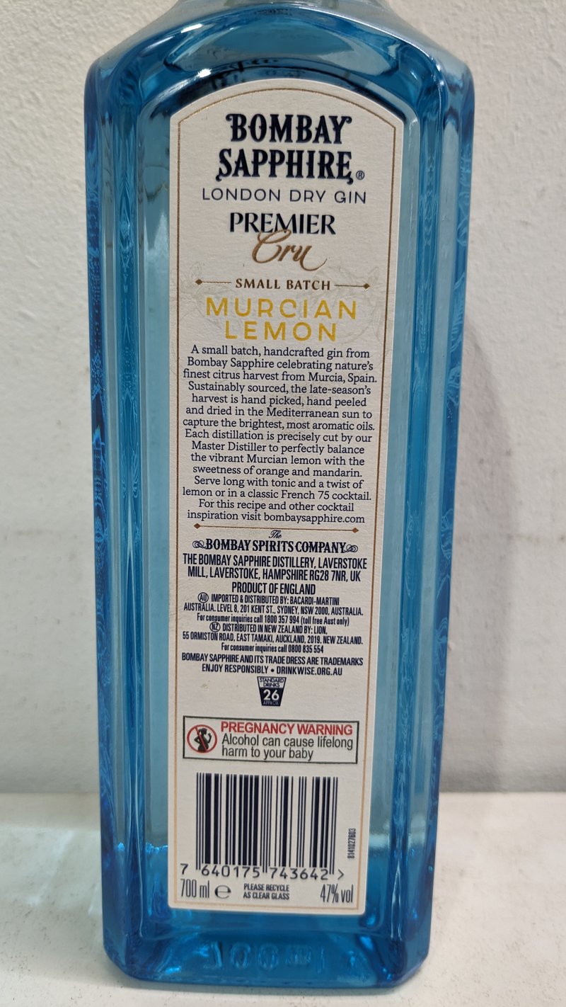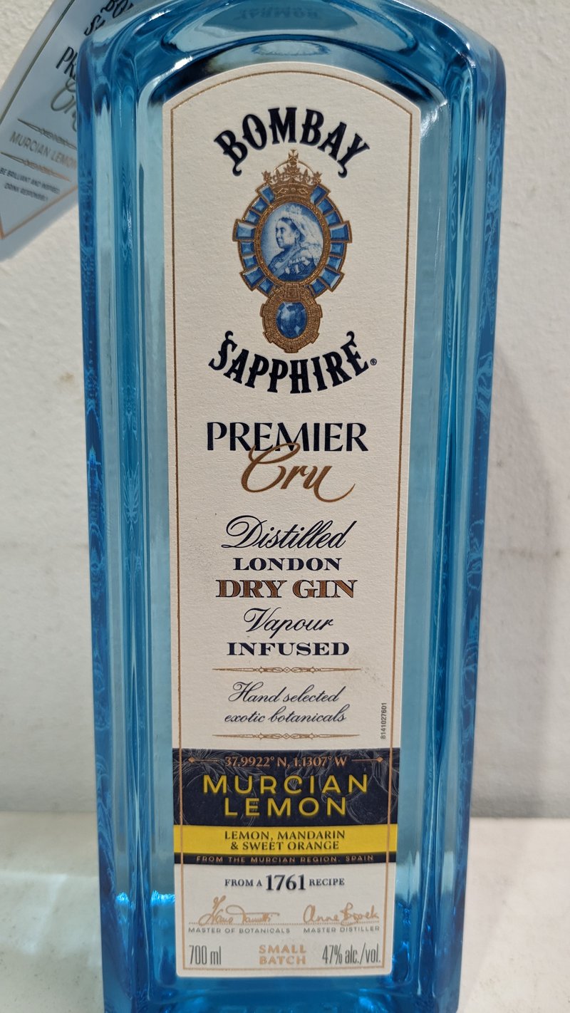 Dry Gin, Bombay Sapphire Premier Gru, Vapour infused, Murcian Lemon, 2021 harvest, 700ml, 47% Alc/Vol