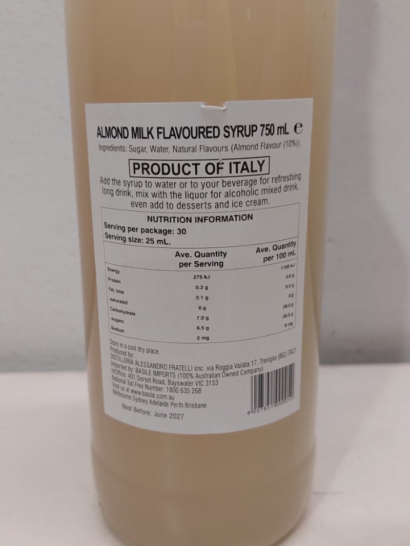 Italian Flavoured Syrup, Latte di Mandorla, Almond Milk Flavouring, Alessandro Fratelli, 750mL