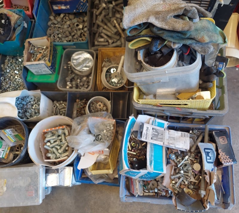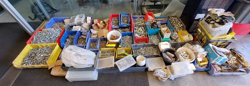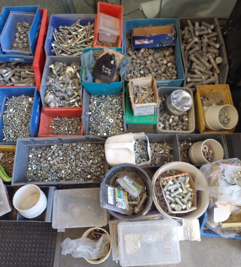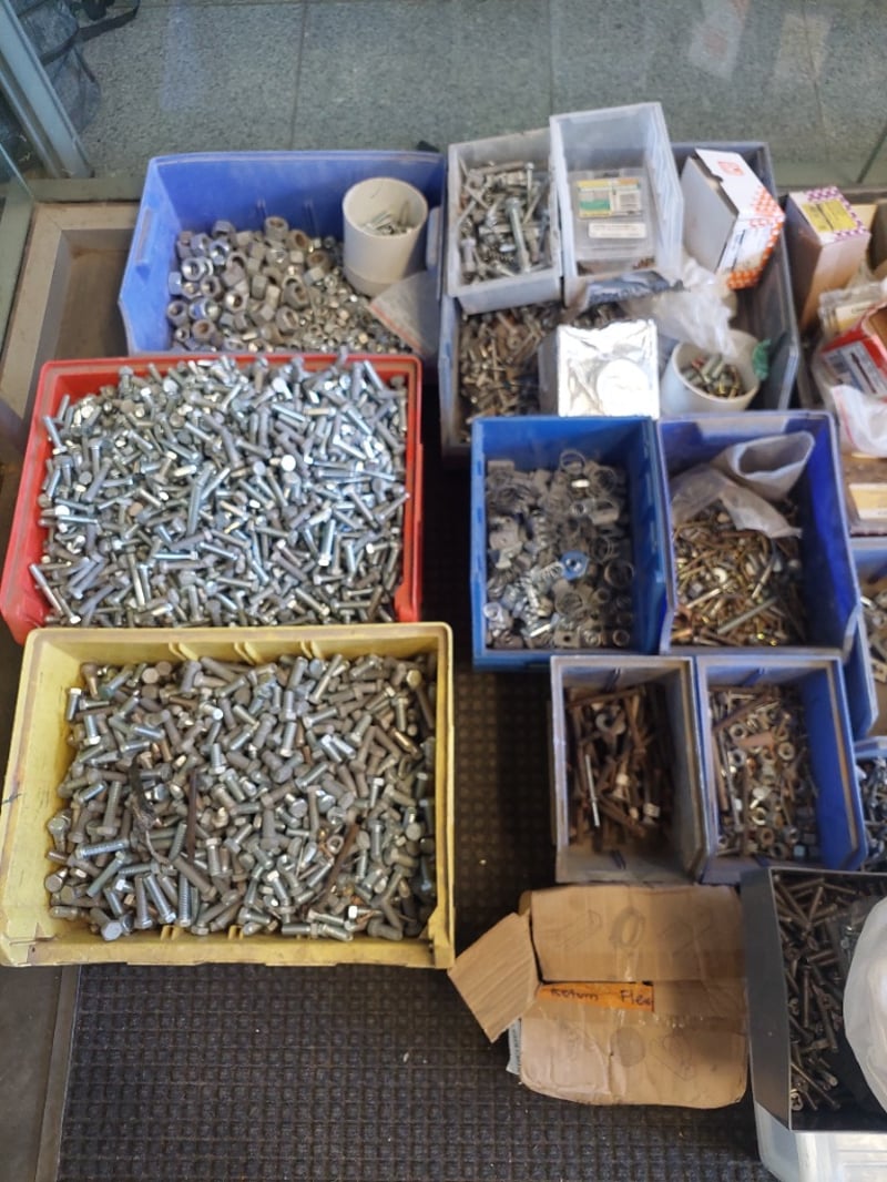 Extensive hardware fastener collection comprising thousands of assorted screws, bolts, nuts, and washers in mixed metals including zinc-plated steel and brass. Inventory organized across multiple color-coded plastic storage bins (blue, red, yellow) and various containers. Contents include machine screws of varying gauges and lengths, wood screws, panel fasteners, nuts in multiple sizes, washers (flat and lock), anchor bolts, and specialty hardware. Some items retain original packaging and product documentation. Suitable for construction, maintenance, engineering, or workshop applications. Note:- Items may be new, used, or untested, and their condition or functionality is not guaranteed.