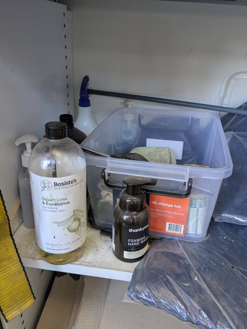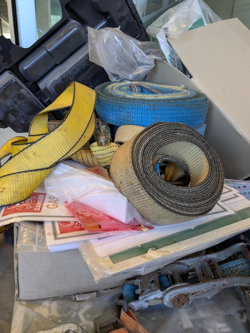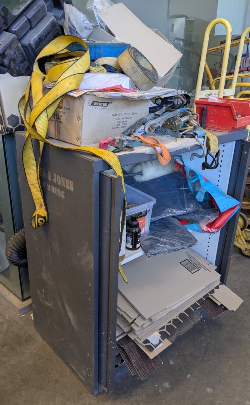Comprehensive tool and equipment storage cart featuring two-tier metal shelving system. Top shelf displays rigging hardware including multiple carabiners, shackles, and pulley systems; coiled strapping materials (yellow, blue, and grey webbing); metal cable/rope coil; cardboard storage boxes; and various fastening hardware. Middle shelf contains organized red plastic component bins, hand wash stations (Bosistos Desert Lime & Eucalyptus, Thankyou Foaming), and 10L storage tub with miscellaneous supplies. Cart fitted with heavy-duty yellow ratchet straps for transport security. Contents include safety-rated lifting and rigging equipment suitable for construction, industrial, or event management applications.