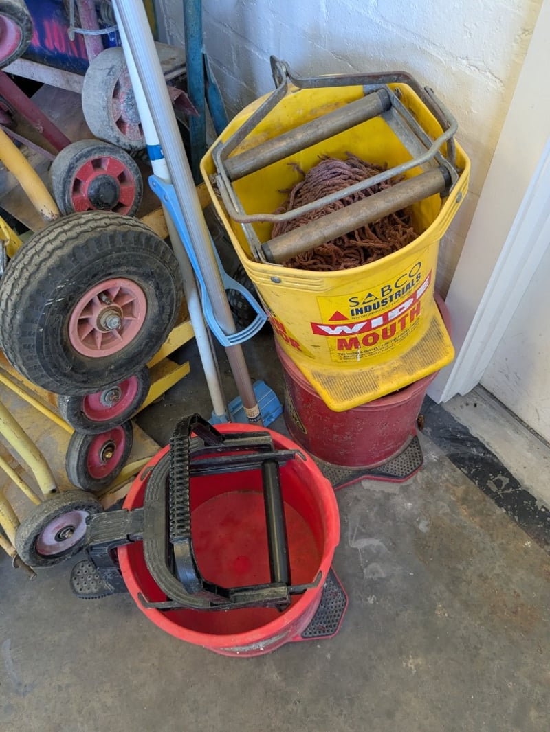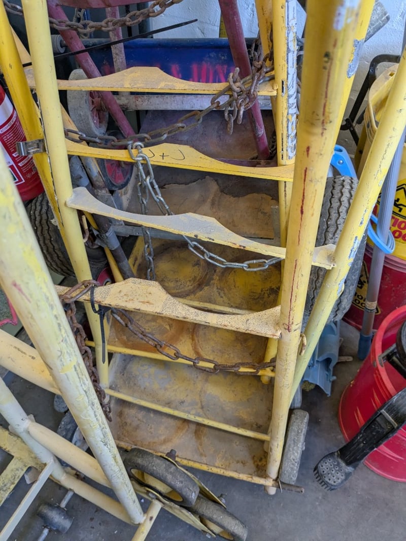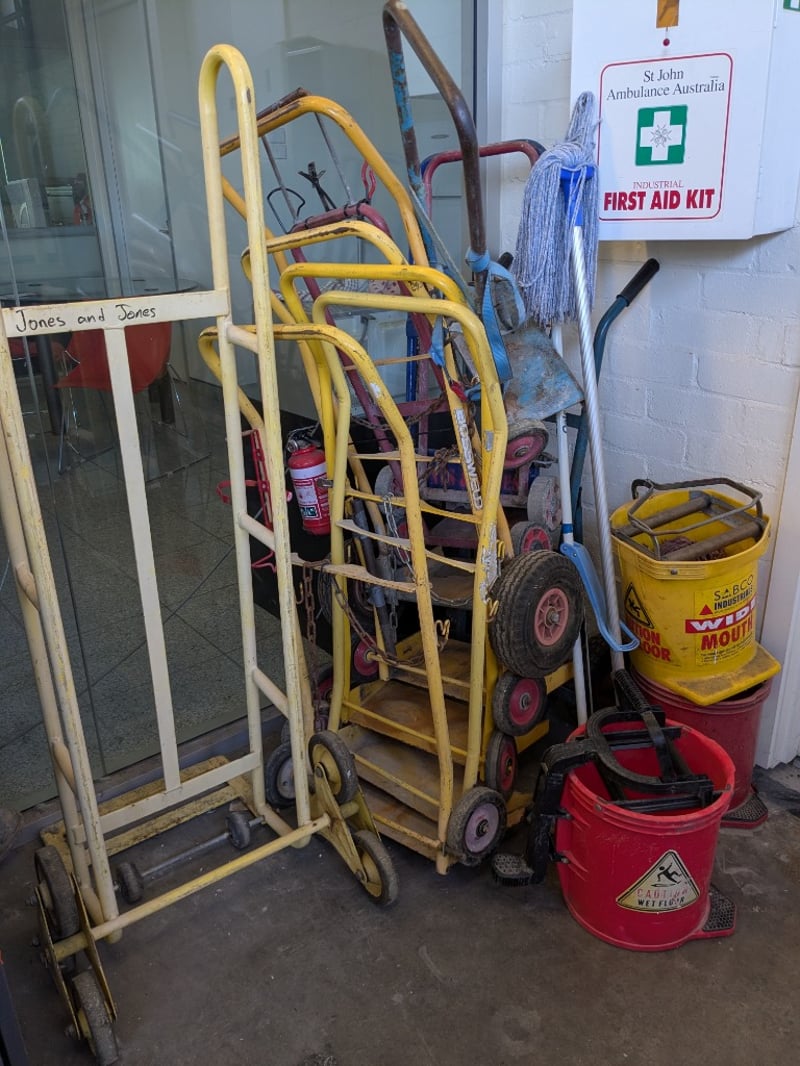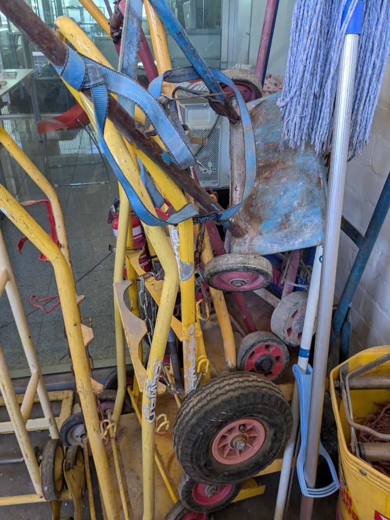 Comprehensive industrial materials handling lot comprising multiple hand trolleys, sack trucks, and accessories. Includes two yellow-framed steel trolleys with red wheels and blue straps - one with chain security mechanism and wooden shelving, one with metal mesh basket. Features rope/coir storage containers in yellow industrial buckets with red bases and carrying handles. Accessories include blue nylon rope (coiled), assorted moving straps, wooden handles, and various spare wheels (red plastic). visible in storage area.Note : Items may be new, used, or untested, and their condition or functionality is not guaranteed.