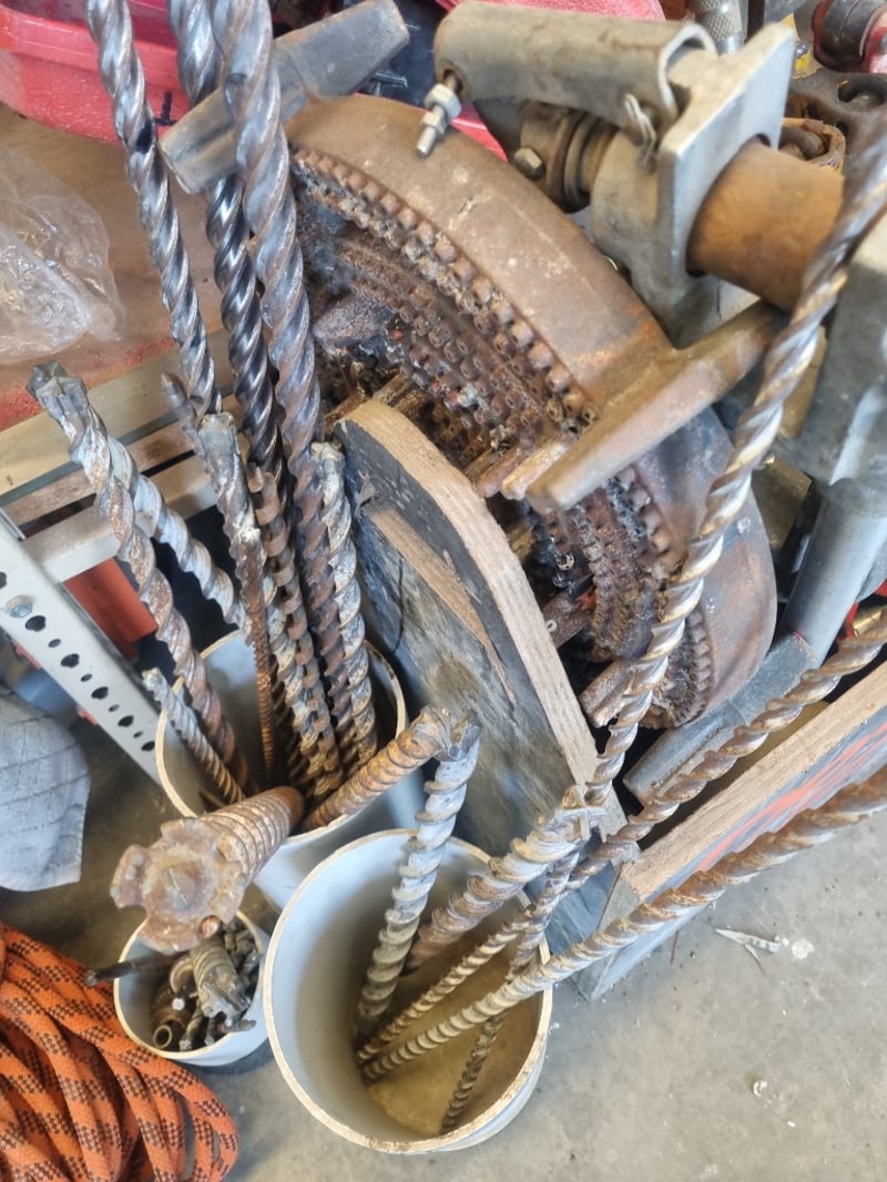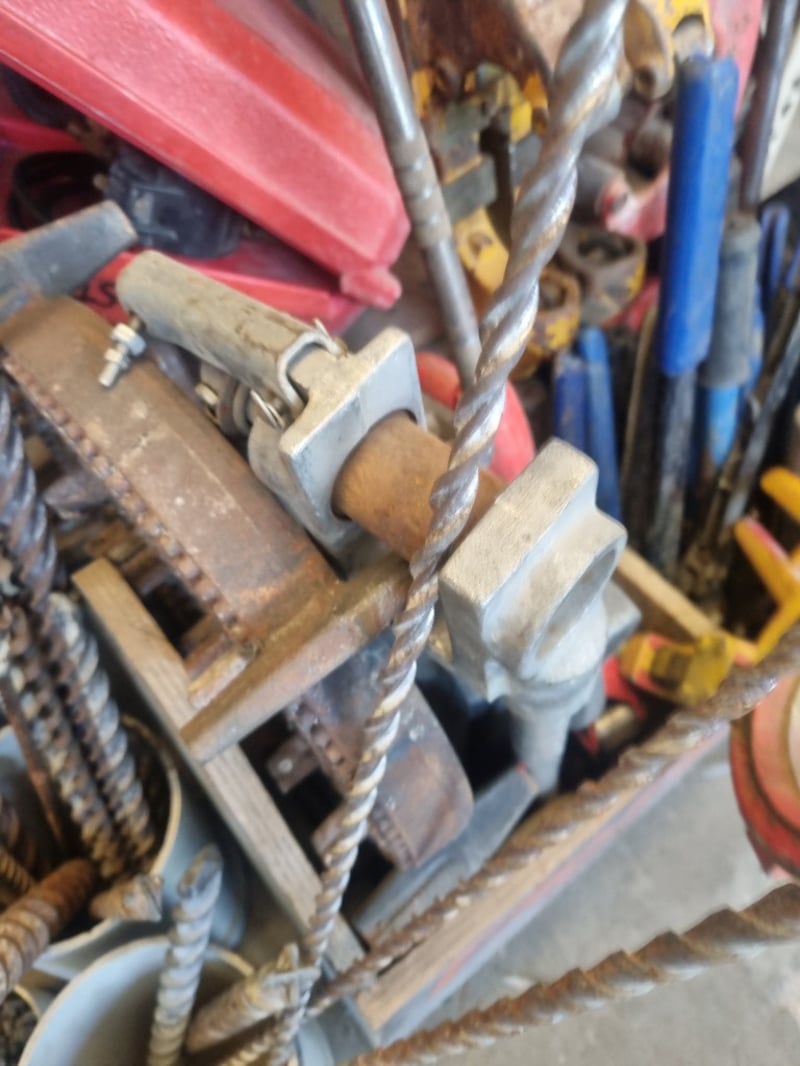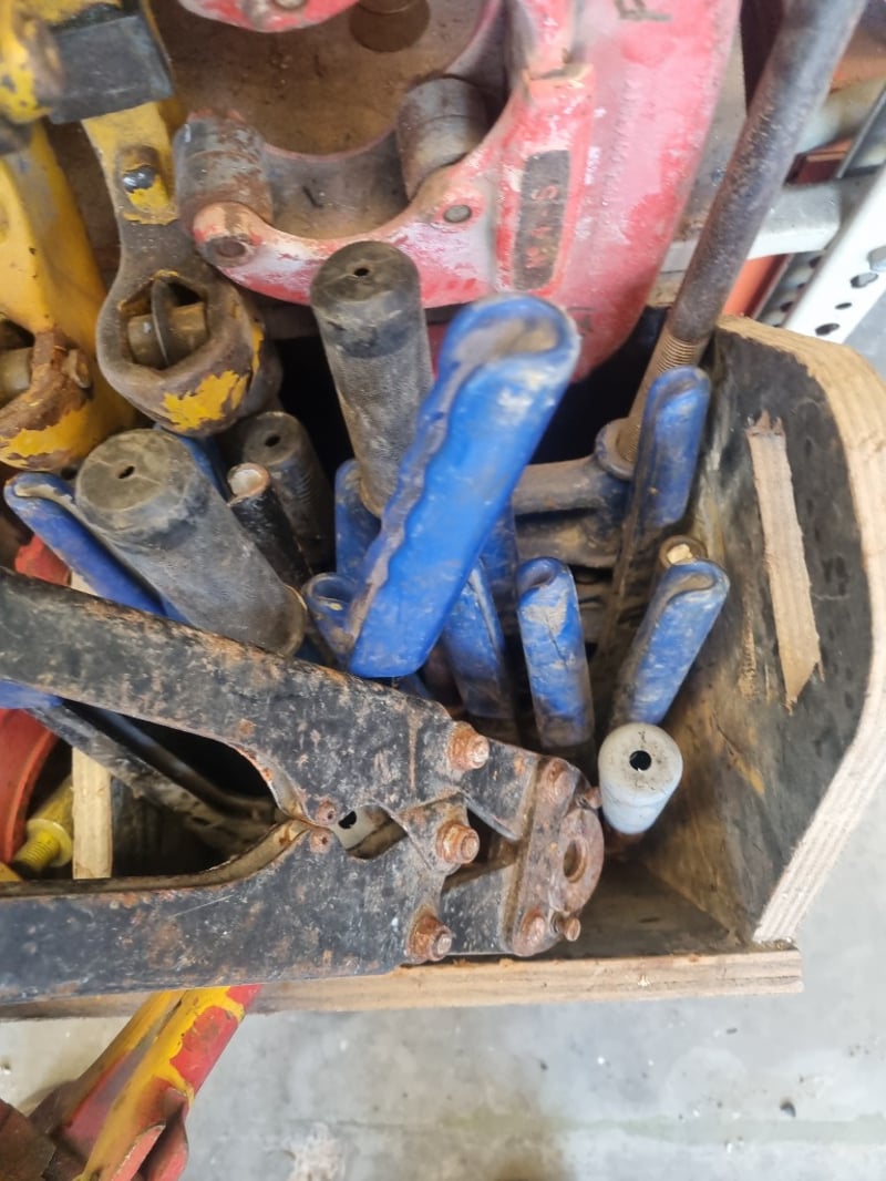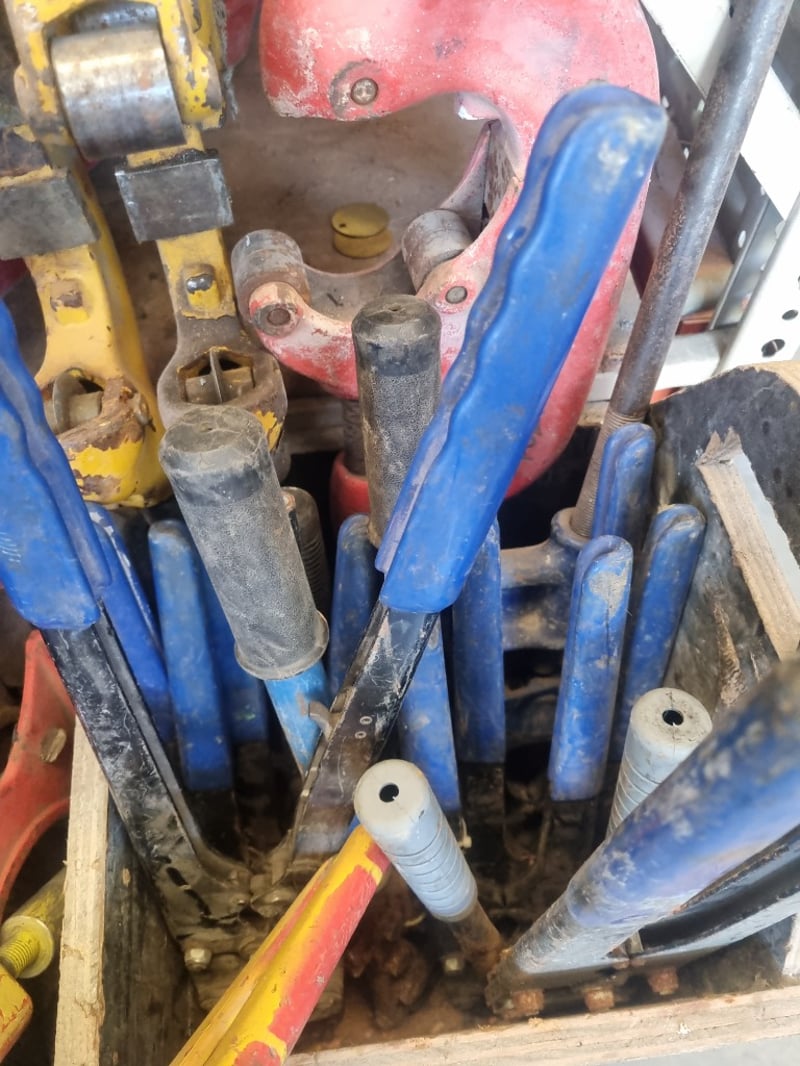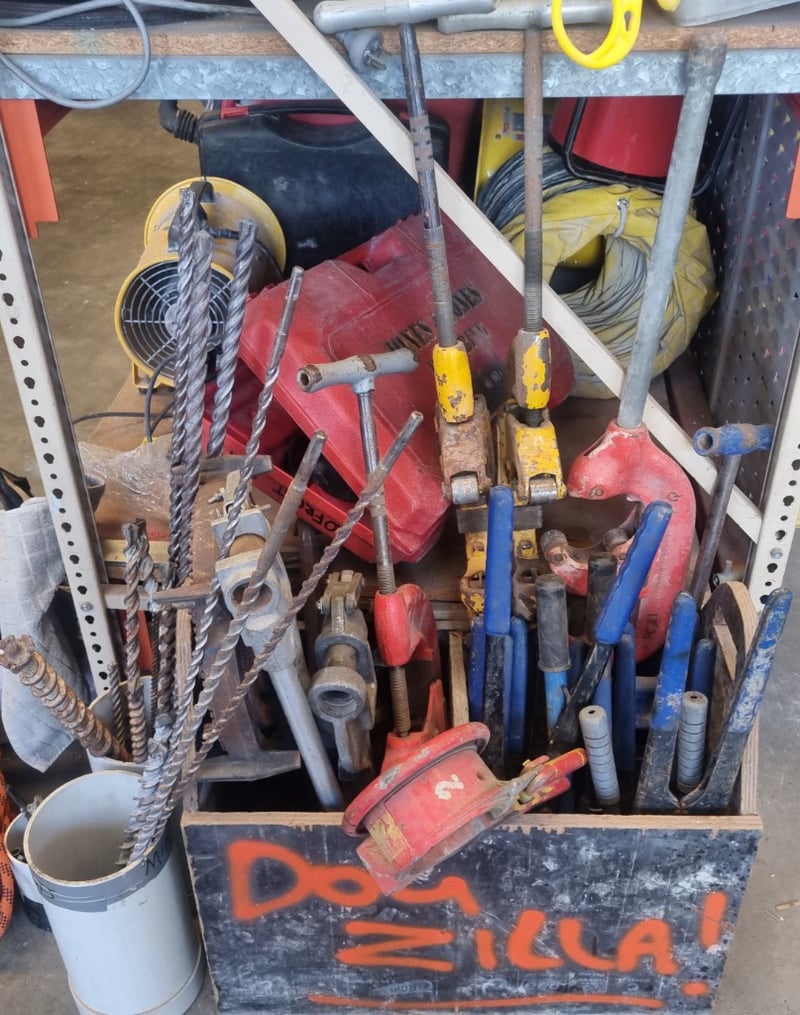 Toolkit housed in a custom-built red and yellow painted wooden toolbox marked "GODZILLA." The collection includes an extensive array of hand tools featuring multiple blue-handled screwdrivers and chisels, red-handled implements, yellow-handled tools, and specialized equipment. Notable items include a yellow portable electric blower/fan, coiled rope rigging in white buckets grade cordage), adjustable wrenches with both yellow and red composite handles, and multiple vices with cast iron frames. The toolbox contains a comprehensive range of metalworking and construction implements, including hammers, pry bars, and specialized fastening equipment. Hardware includes galvanized fixings and white porcelain insulators typical of electrical or rigging applications.