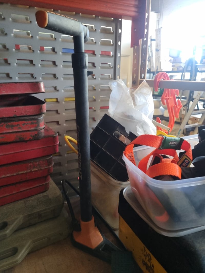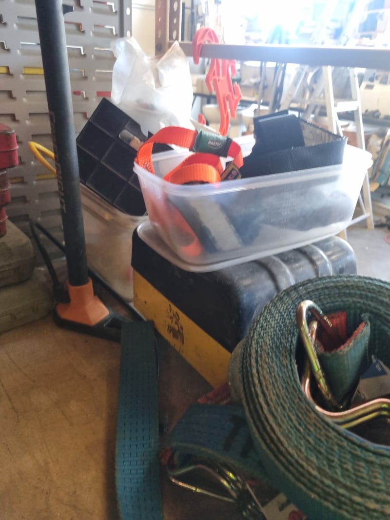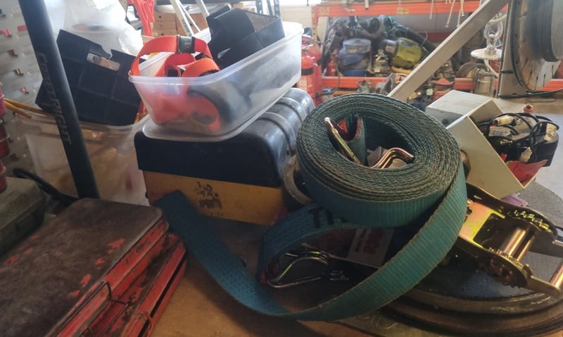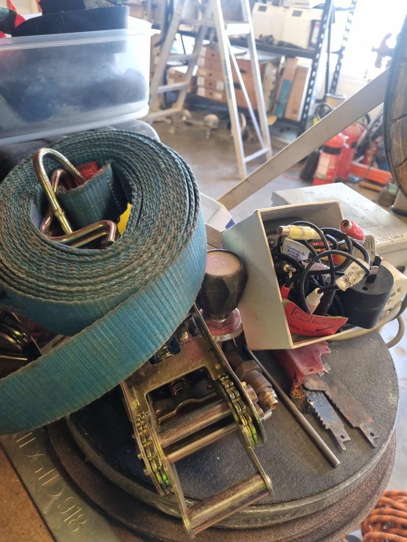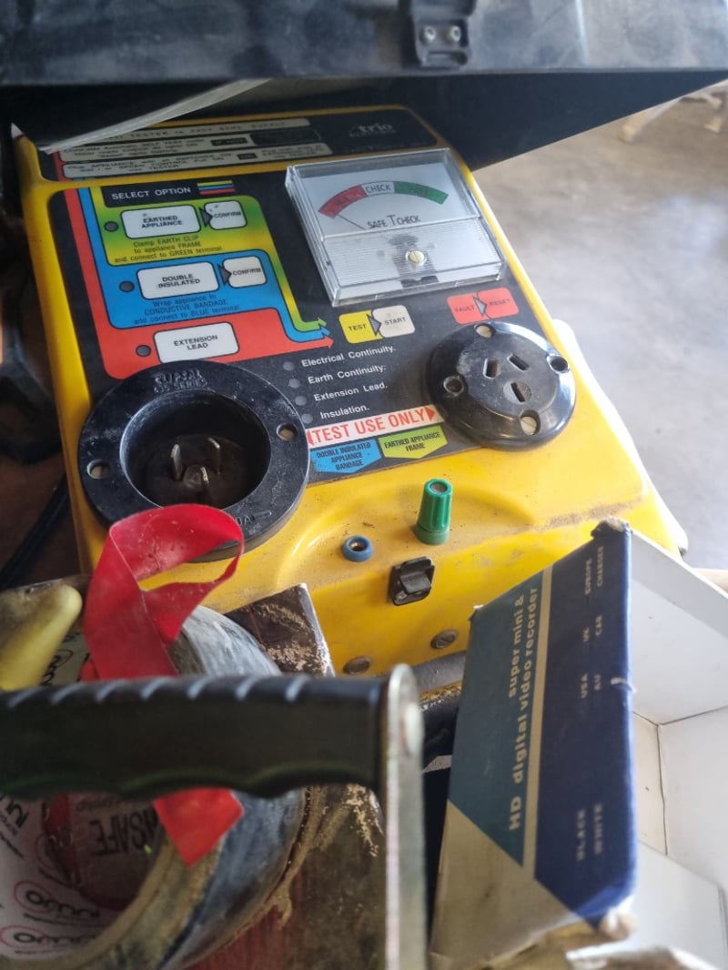 Industrial and electrical safety equipment and tools. Includes green polyester ratchet straps, red safety harnesses and straps, orange and red work gloves, black work boots, portable electrical continuity and insulation tester (yellow casing, "Safe Tester" model with multi-function capabilities including earth continuity, extension lead, and insulation testing), various electrical connectors and male connectors in sealed packaging, extension cords with red RCA connectors, hand tools, storage containers with assorted fasteners and hardware.