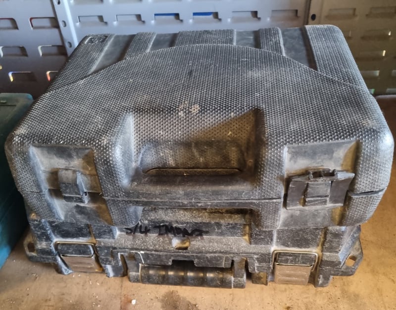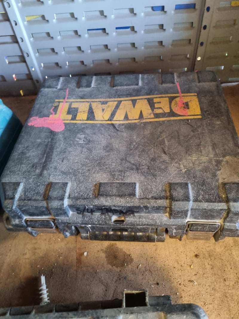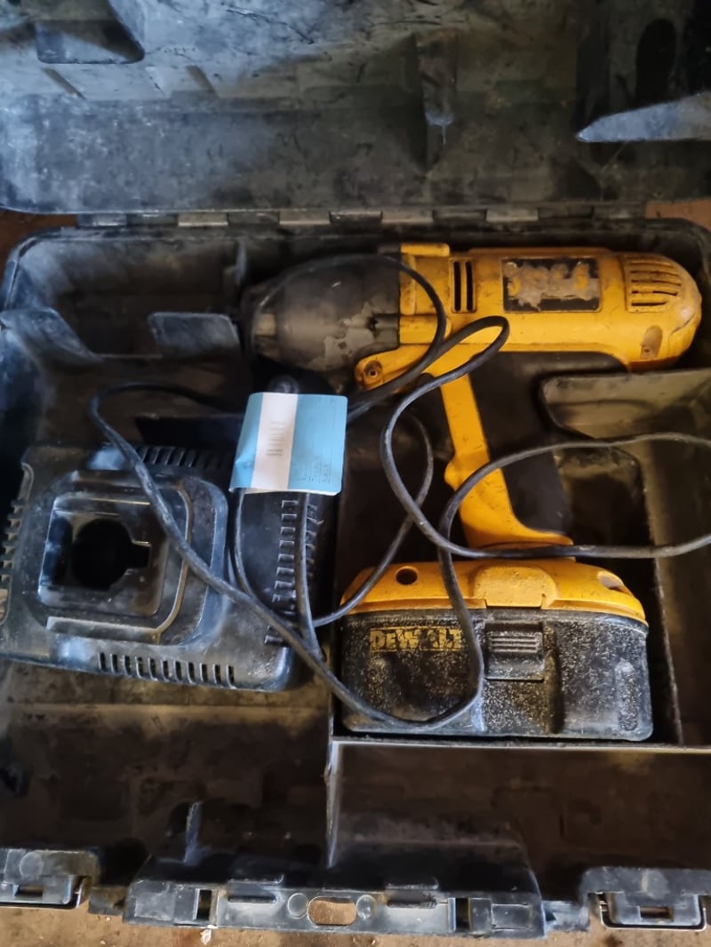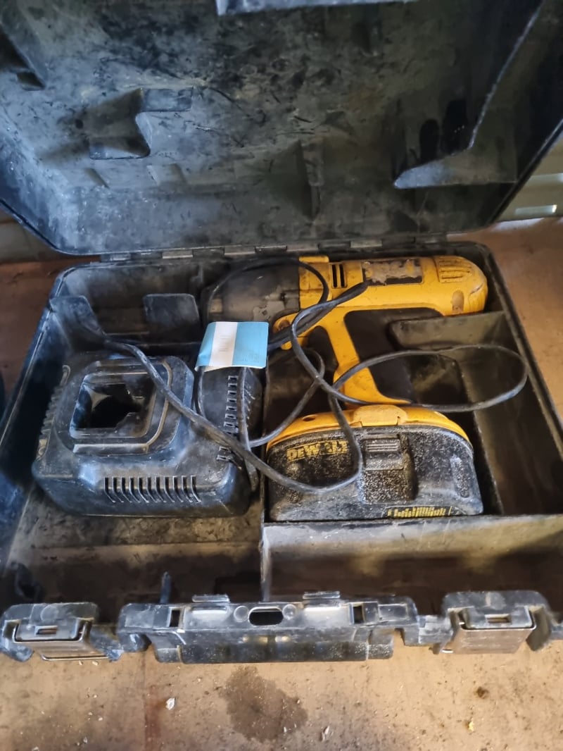 DeWalt DCD771D2 10.8V compact cordless drill kit housed in original carrying case. Kit includes two NiCd batteries, charger unit, and drill/driver tool. Case shows significant wear with dust accumulation and minor cosmetic damage to exterior. Interior retains original foam inserts with tool-specific compartments. Drill features ergonomic yellow and black design typical of DeWalt's entry-level range. Note: Note : Items may be new, used, or untested, and their condition or functionality is not guaranteed.