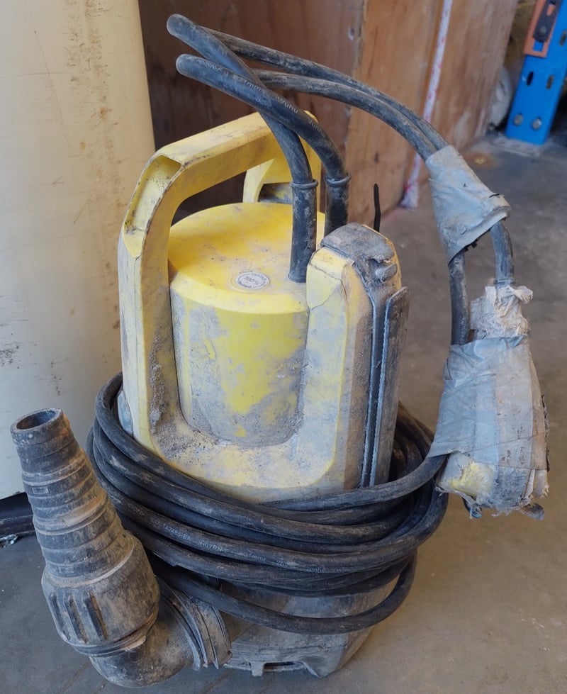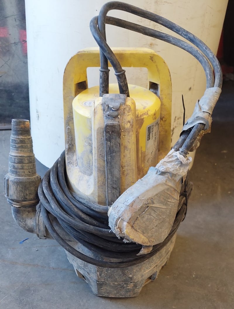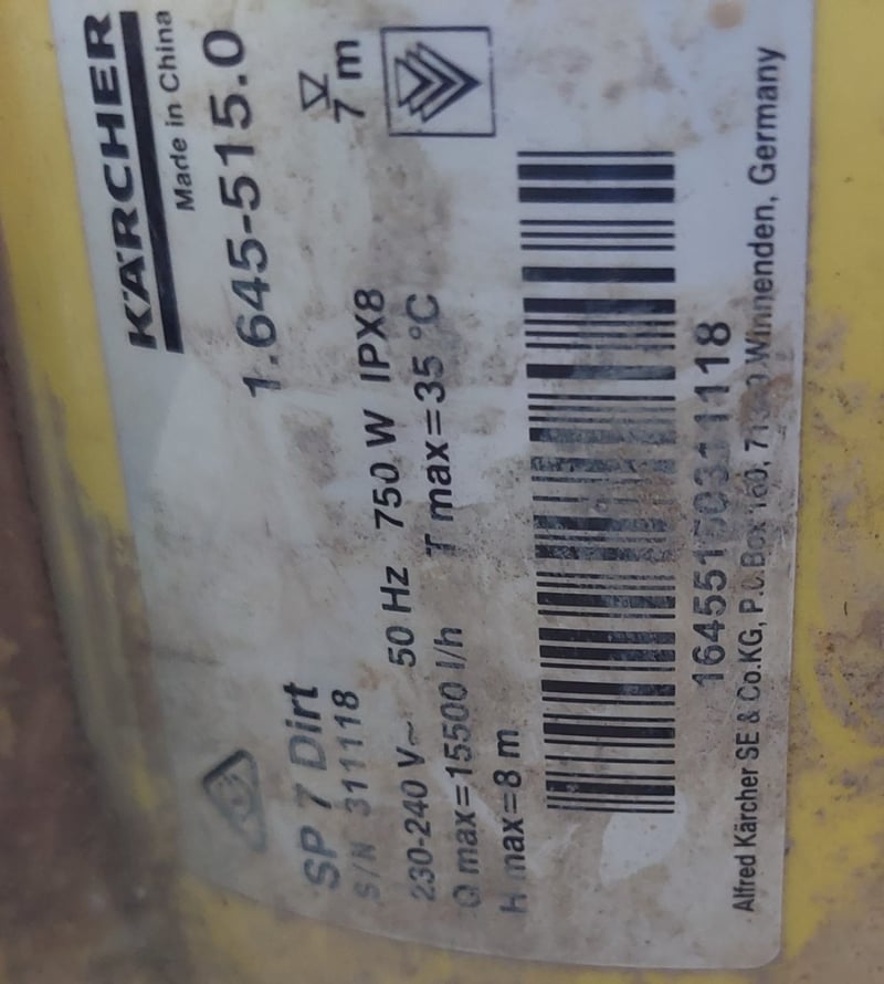 Kärcher SP7 Dirt submersible pump, model 1.645-551.0, manufactured in Germany. Yellow and black industrial-grade unit featuring dual handle design for portability. Equipped with 750W IPX8 motor, 50Hz operating frequency, and maximum 35°C operating temperature. Delivers 1500 l/h flow rate with 8m maximum head. Includes black rubber power cable with weathered protective wrapping. Substantial cast iron base construction. Note: Note : Items may be new, used, or untested, and their condition or functionality is not guaranteed,Unit shows signs of extended outdoor/industrial use with visible surface corrosion.