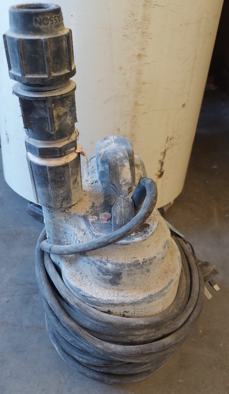 Industrial submersible pump assembly featuring a Nossvide-branded motor unit with segmented hexagonal casing and integral carry handle. The pump comprises a multi-stage centrifugal design with stacked impeller chambers, brass/bronze casting throughout, and heavy-duty construction typical of mining or agricultural applications. Features a detachable motor head with terminal box and power cord (appears operational). Includes rubber vibration isolation base with mounting provisions.