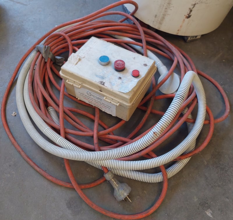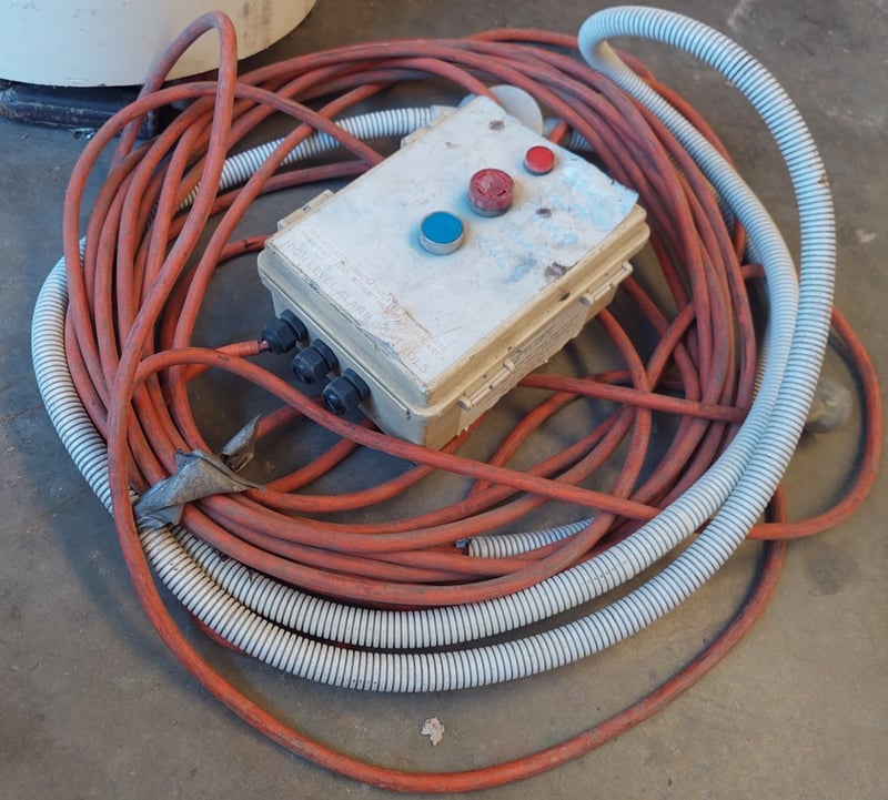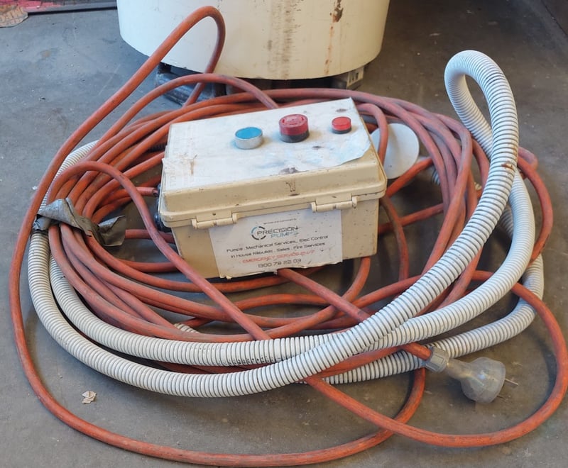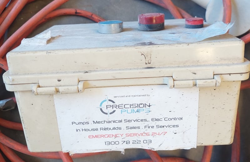 Precision Pumps electrical control box with integrated cable management system. Beige/cream weatherproof enclosure housing three control buttons (blue, red, and pink) mounted on top. Features heavy-duty orange power cable (approximately 50m coiled) and white corrugated conduit tubing for pump connections. Includes emergency service contact labelling (1300 78 22 03). Control box equipped with multiple electrical terminals visible on underside. Equipment shows signs of field use and weathering consistent with active commercial pump operationNote: Note : Items may be new, used, or untested, and their condition or functionality is not guaranteed.