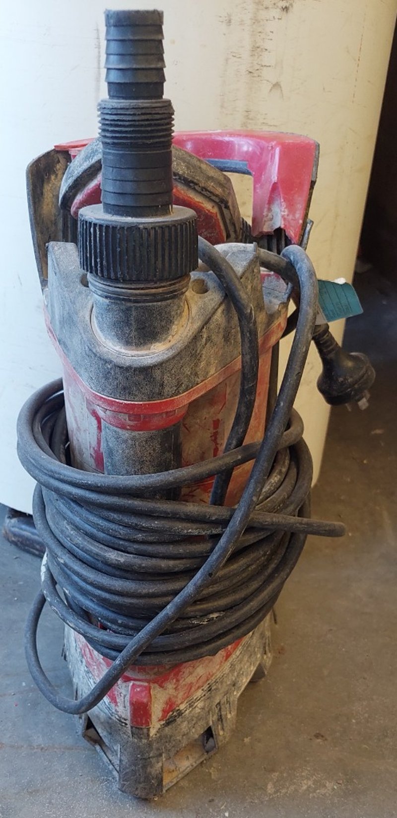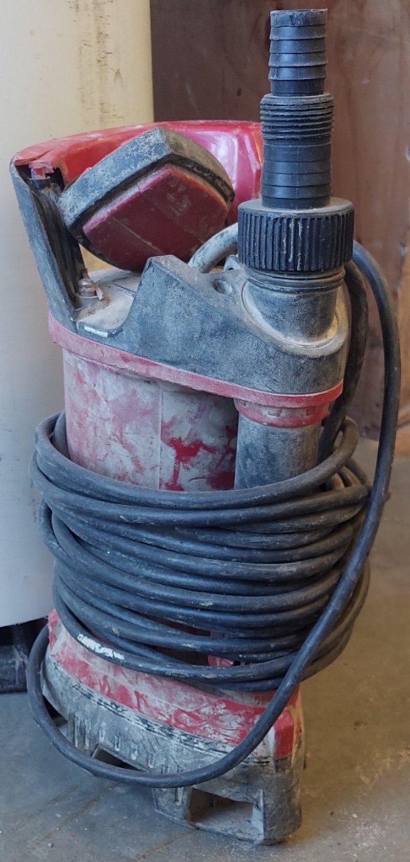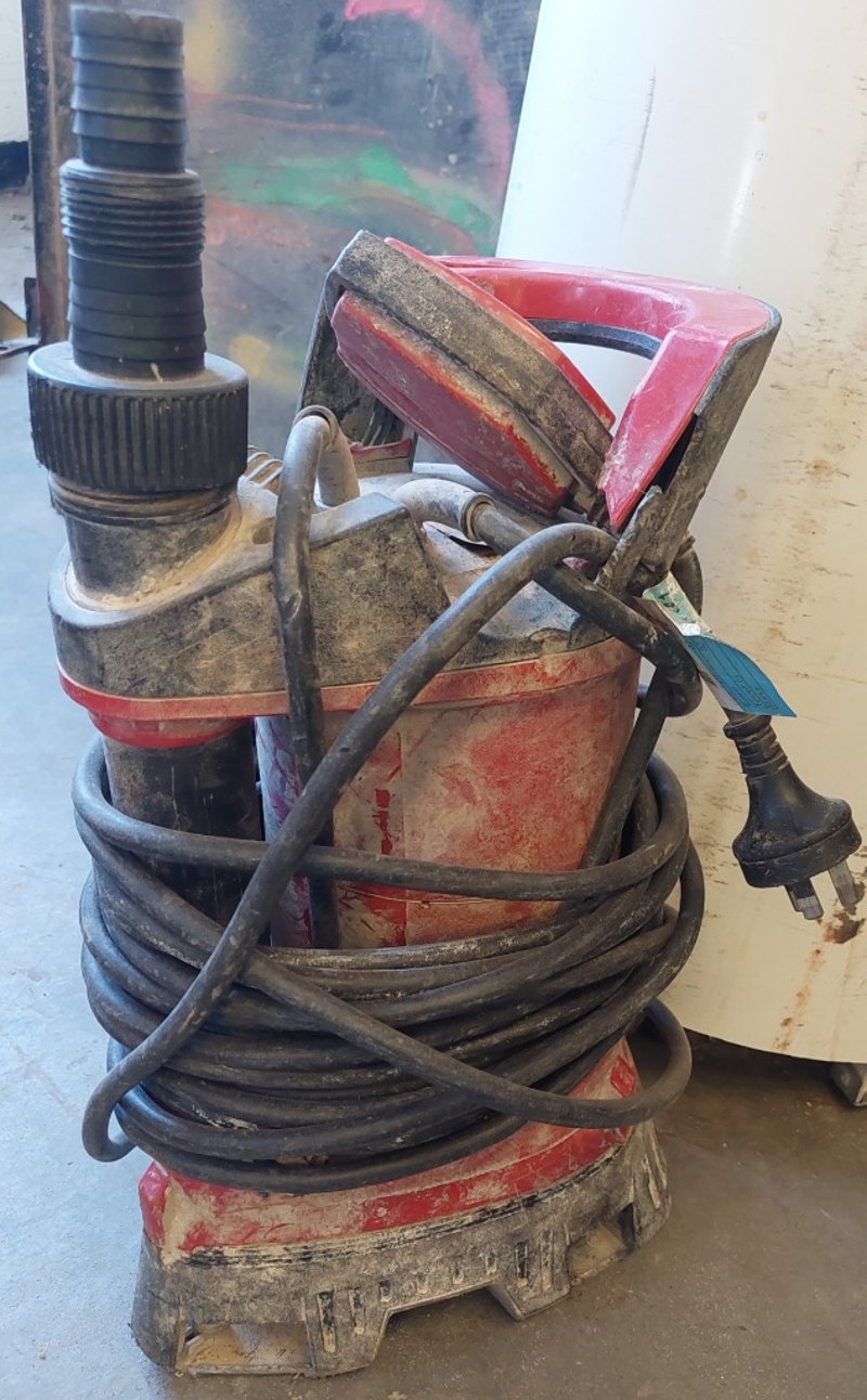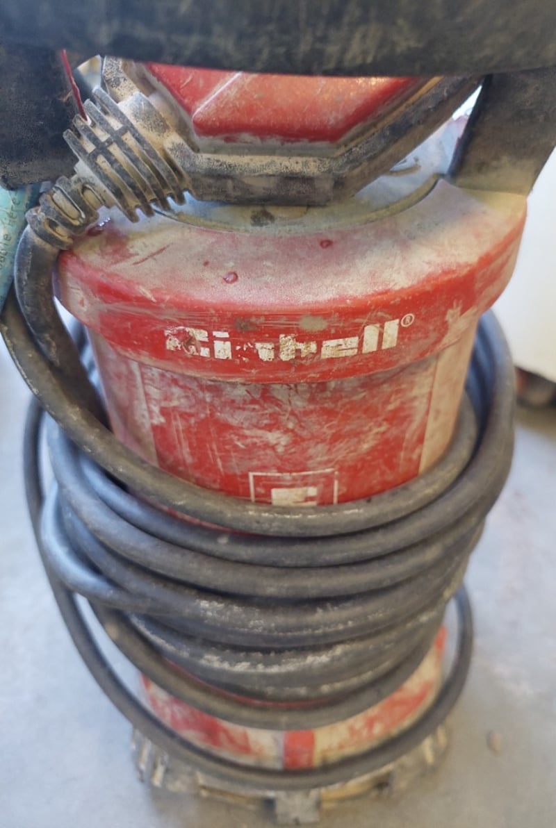 Vintage like submersible pump unit, , featuring a red metal housing with weathered patina. The assembly comprises a multi-stage centrifugal pump mechanism with stacked impeller rings (visible in close-up), threaded steel shaft extending approximately 60cm, and ribbed coupling collar. Black power cable (approximately 10 meters) neatly wound around base. Pink/red painted metal bracket arms provide structural support. borehole applications.