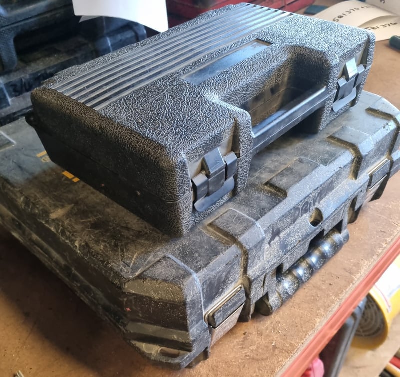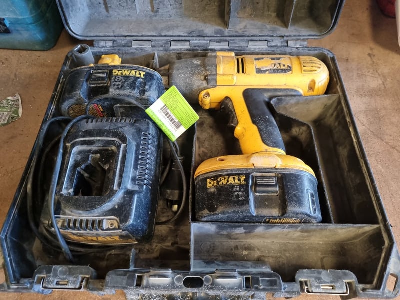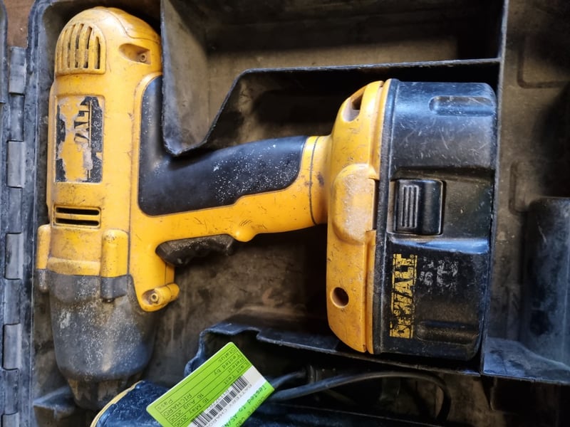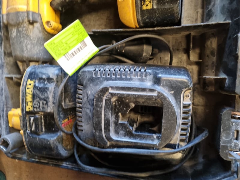 DeWALT cordless power tool kit featuring two 18V XRP drill/drivers with charger and batteries. The system includes a dual-port charger unit , two black DeWALT batteries (one appears depleted), and yellow compact drill/impact driver. Substantial hard case with reinforced latches, yellow and black branding, and molded compartments. . Charger unit displays control panel with adjustment knobs and indicator lights. Case interior features custom foam inserts providing secure tool storage.